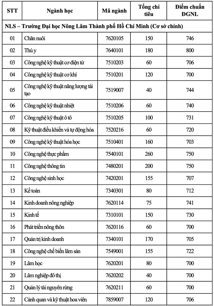 Về điểm chuẩn phương thức ĐGNL, biến động giữa 42 ngành (đại trà, tiên tiến, chất lượng cao) của trường từ 700 đến 800 điểm. Cao nhất là ngành Thú y với 800 điểm.