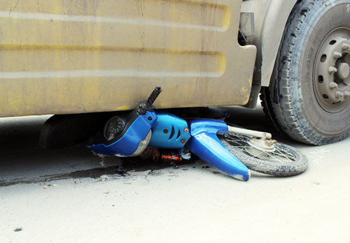 Xe máy của nạn nhân bị xe containet cuốn dưới gầm. Ảnh: An Nhơn