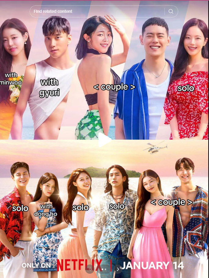 Một clip quảng bá khác được đăng tải bởi Netflix tiếp tục củng cố suy đoán này của khán giả. Trong nội dung kêu gọi có mặt cả dàn thí sinh, Si An và Jeong Su đứng cạnh nhau “sát rạt” trong khi Jun Seo và Jang Theo “sánh đôi” ở nửa đối diện. Nữ người mẫu còn có hành động tạo hình nửa trái tim hướng về phía nam người chơi 35 tuổi.