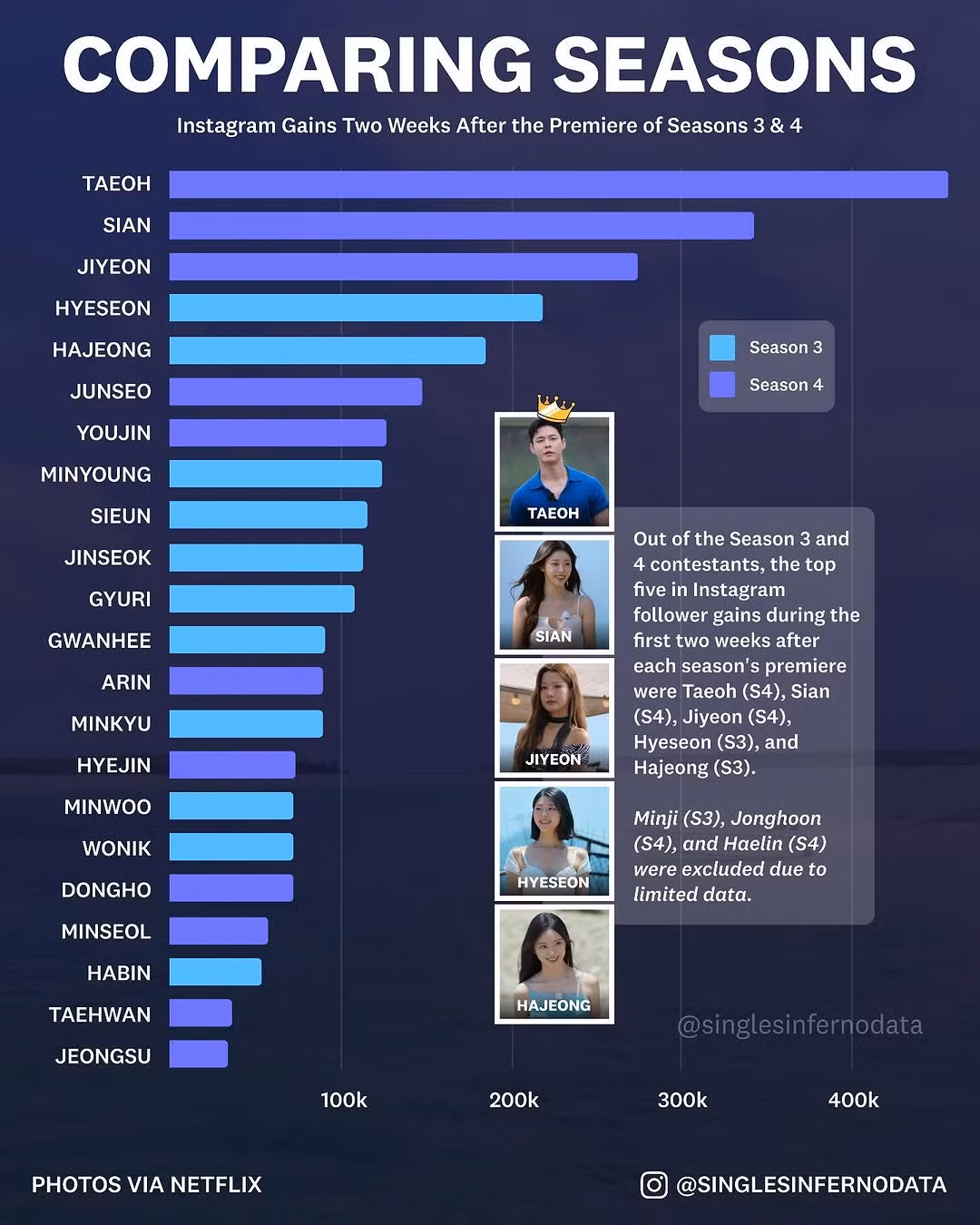 Thống kê dữ liệu trong hơn 2 tuần công chiếu, Jeong Su "lép vế" nhất về mức độ tăng trưởng người theo dõi trên Instagram so với dàn cast chính của cả 2 mùa Địa Ngục Độc Thân 3 & 4.