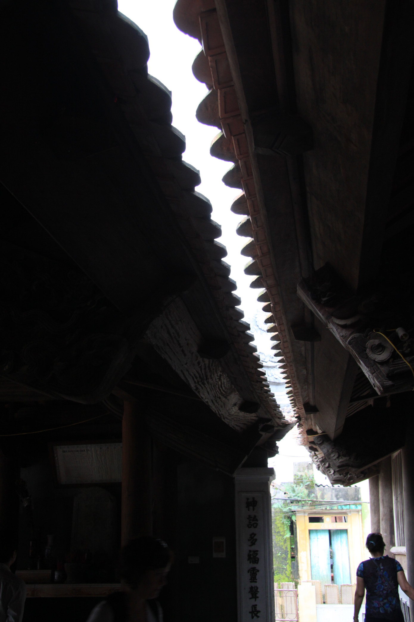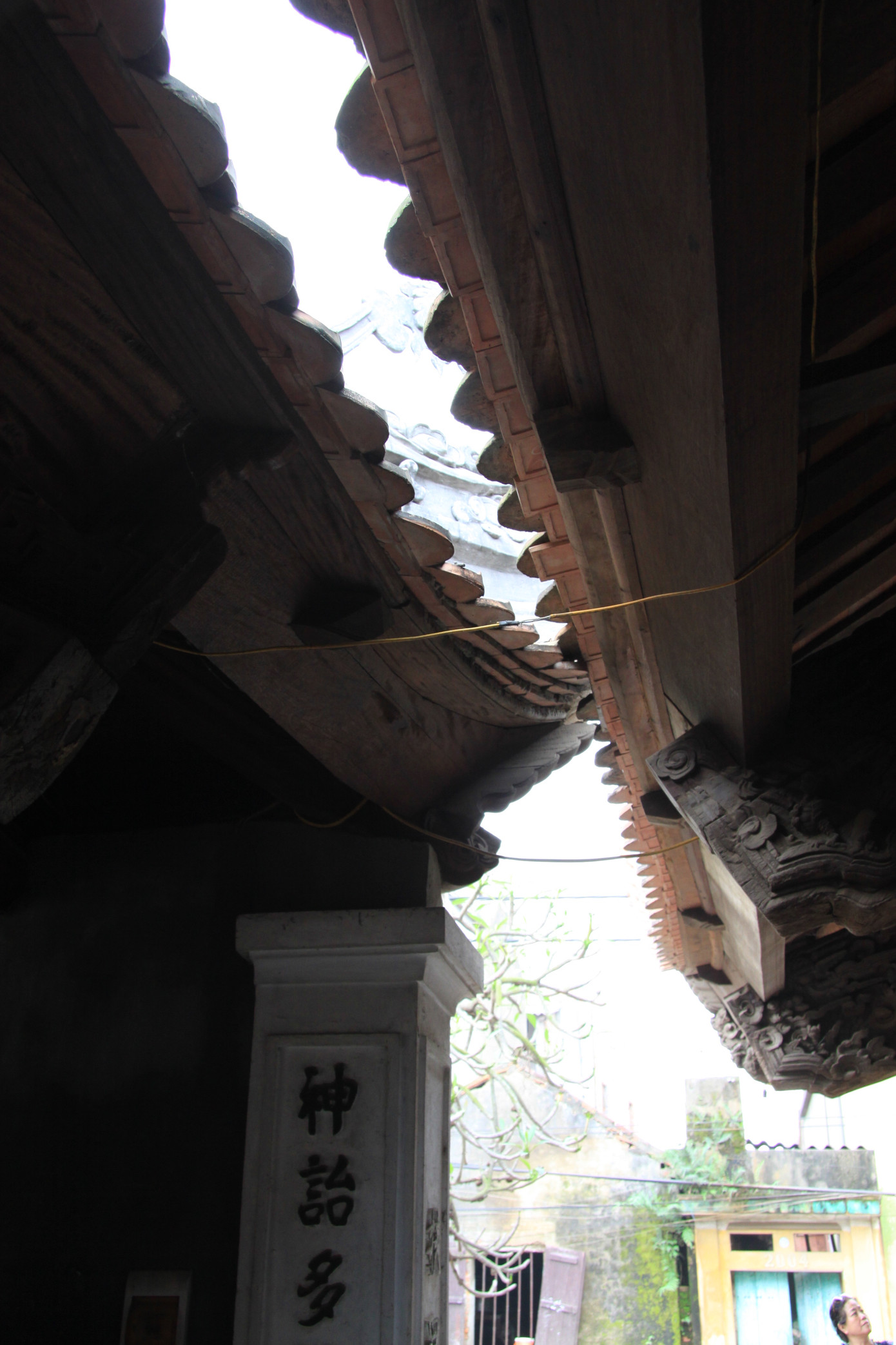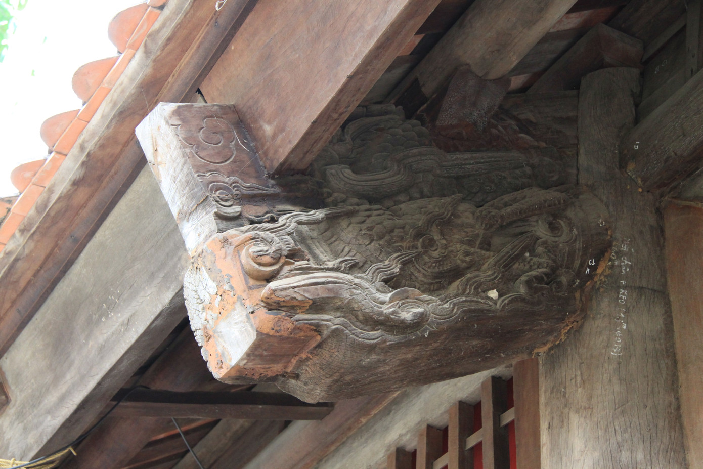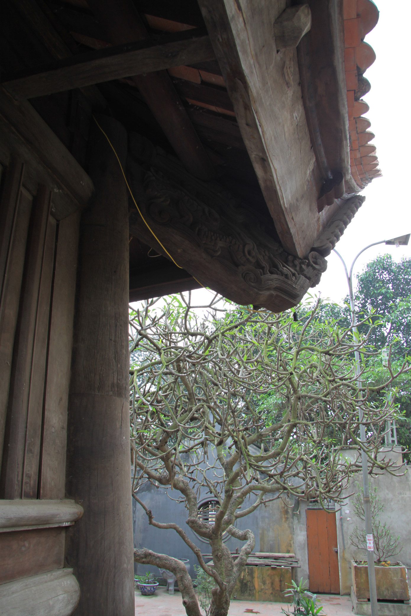 Mái lợp ngói mũi hài, to bản, 4 góc là những đầu đao cong vút. Hoa văn rồng phượng ẩn hiện trong mây hài hoà cùng người và cỏ cây, hoa lá, muông thú còn ghi lại dấu ấn bàn tay tài hoa của người thợ khắc.