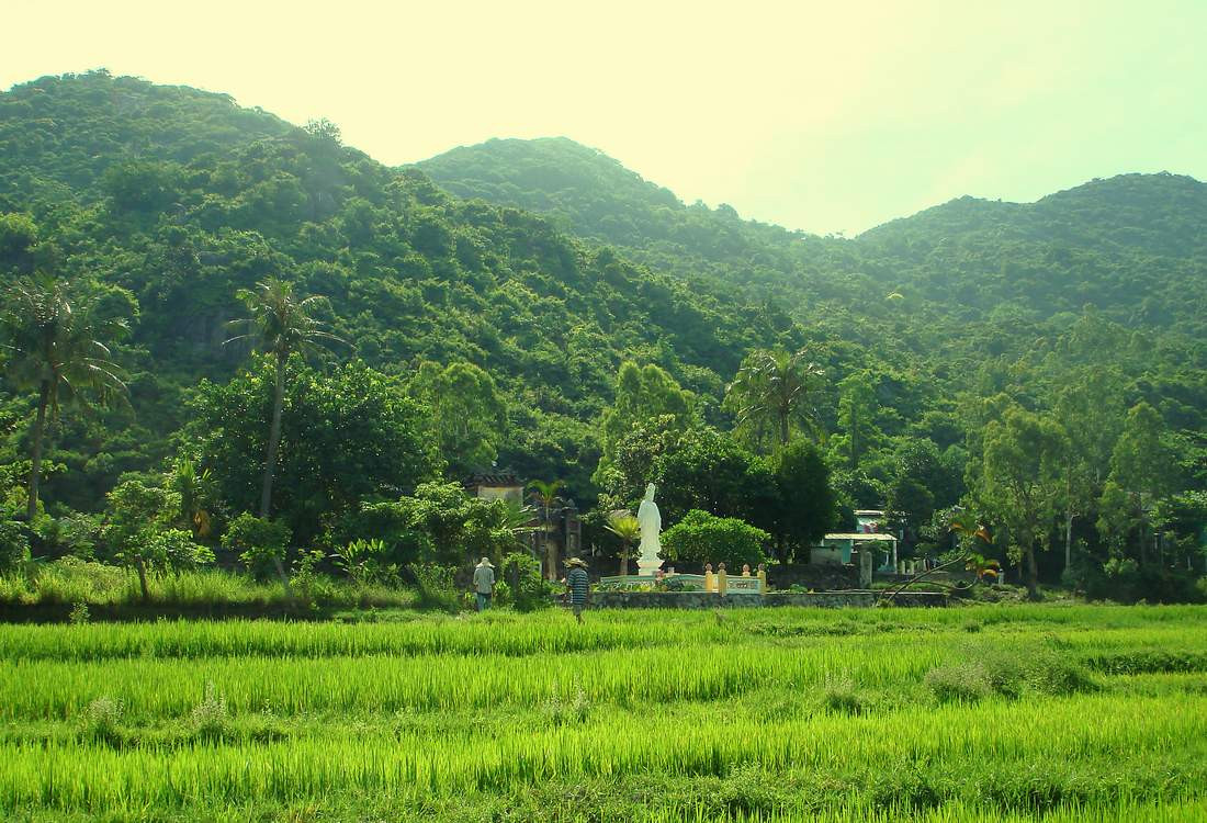 Ngay dưới chân là đồng ruộng, khu dân cư và mờ xa về đất liền là Đô thị cổ Hội An. Phía Nam có khoảng trống gió lùa trải dài qua Rừng Cấm (nay là Xóm Cấm) đưa hơi nước từ Hòn Nhờn lướt qua trước mặt thổi lên khu dốc Chùa.