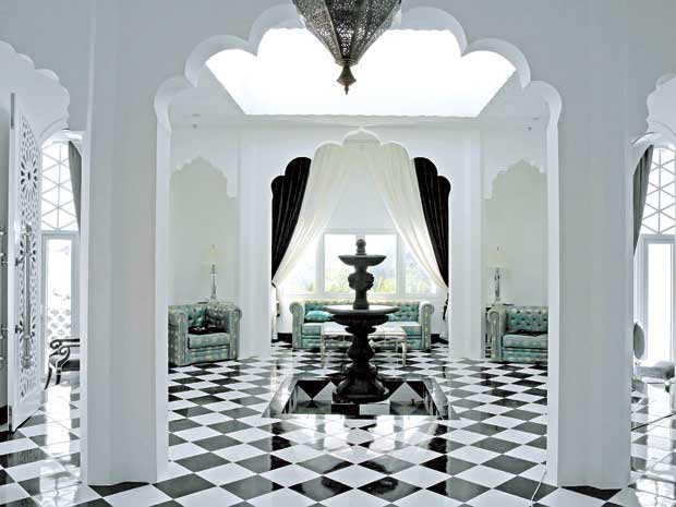 Toà lâu đài với 19 phòng, mỗi phòng được thiết kế hoàn toàn khác biệt, toàn bộ nội thất chỉ với hai gam màu chủ đạo trắng và đen, điểm xuyết một chút ánh đỏ từ những hoa văn trên chiếc khăn quàng của thiếu nữ Ấn Độ, hay một chút bạc kiêu sa từ bộ đồ ăn hoàn toàn của Versace.
