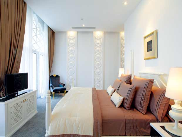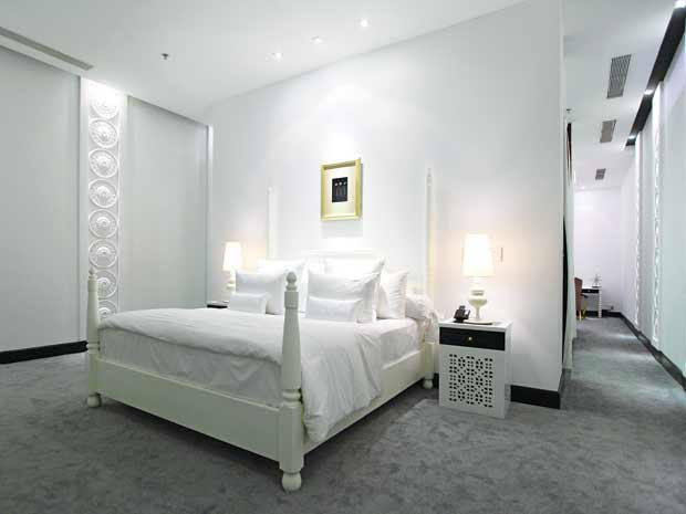 Phòng tổng thống với diện tích 260m2 là một không gian lộng lẫy và choáng ngợp. Tất cả đều nhìn ra hướng sông. Một hồ bơi biếc xanh nằm lọt giữa lâu đài, hắt lên những hoa văn trắng được trang trí với các môtíp hoa lá theo kiểu phù điêu đắp nổi. Những vòm trần và các bức tường được trang trí các hình học phức tạp, mô phỏng theo kiến trúc Mogon và kiểu chữ viết cổ rất đẹp và bóng bẩy của người Ấn Độ…