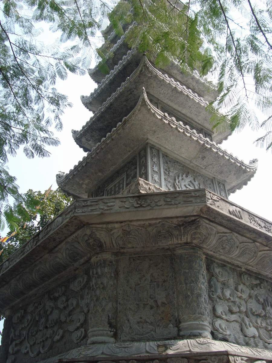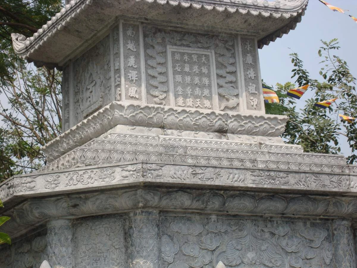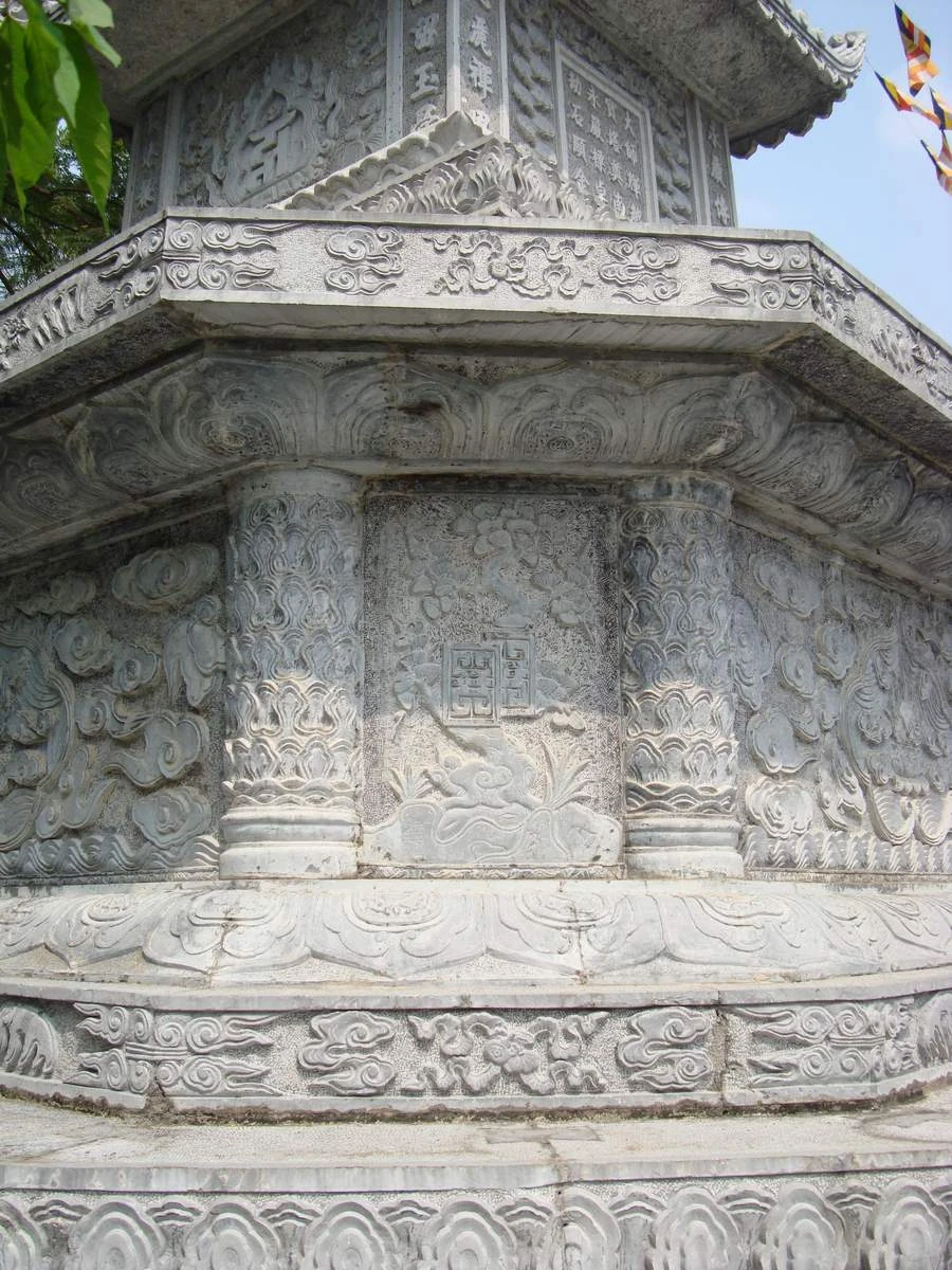 Năm bậc cấp từ hai cột chính bằng đá bước lên tòa tháp tượng trưng cho “ngũ căn, ngũ lực” của nhà Phật. Trên thân tháp có một cặp rồng lớn, 27 cặp rồng nhỏ và những cánh phượng uốn mình rất hoành tráng.