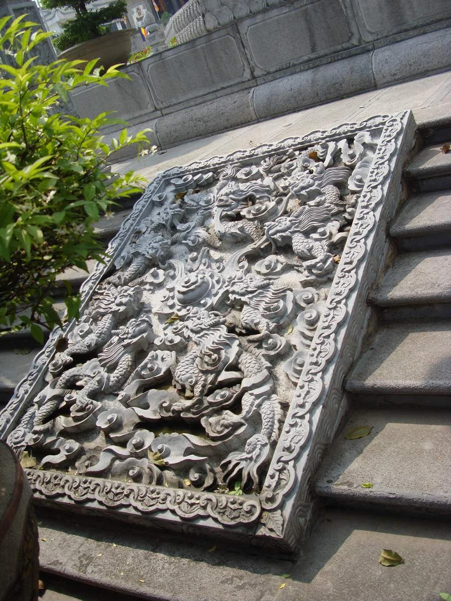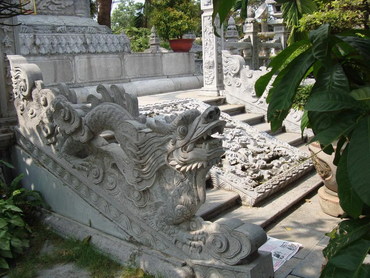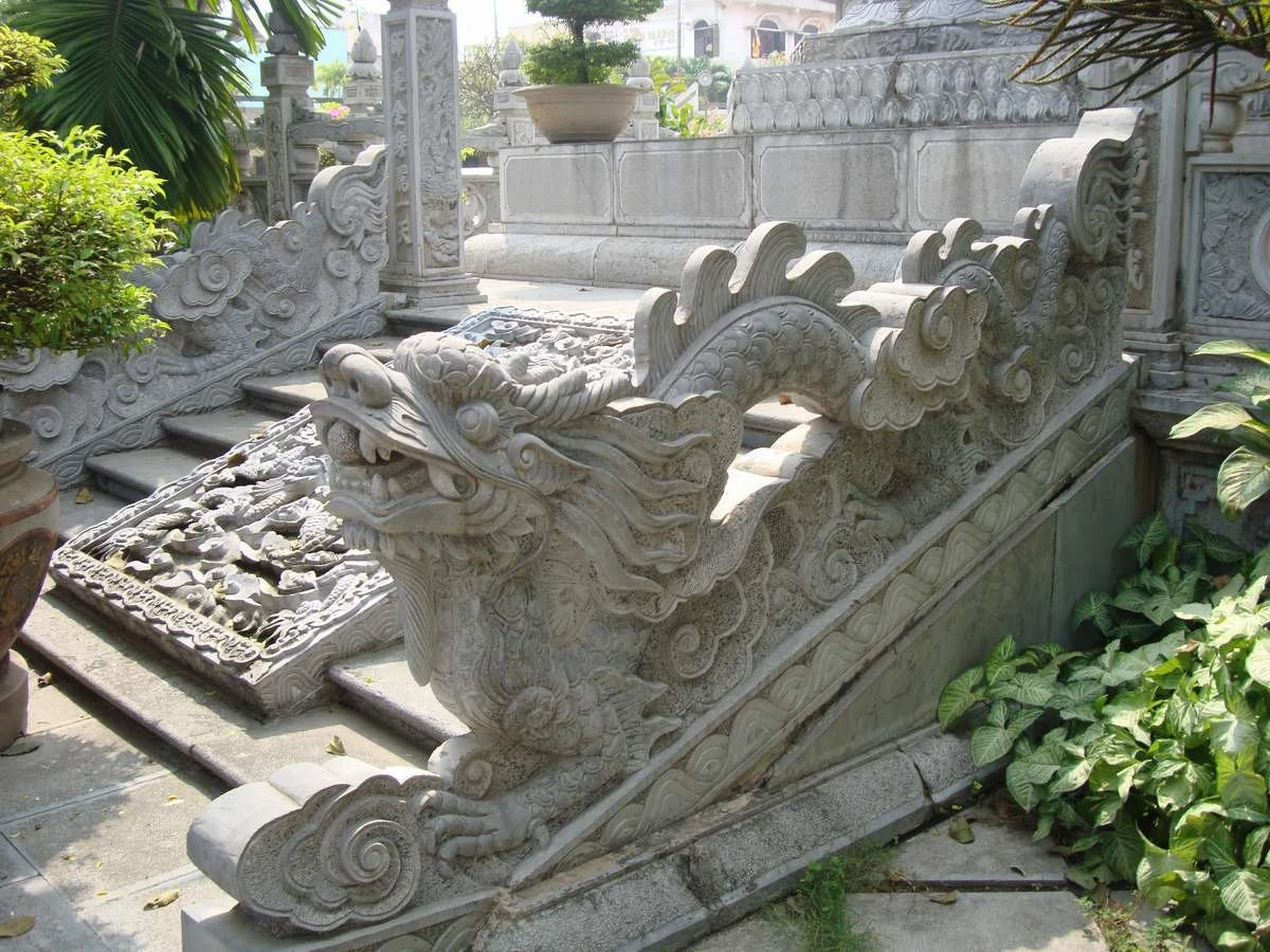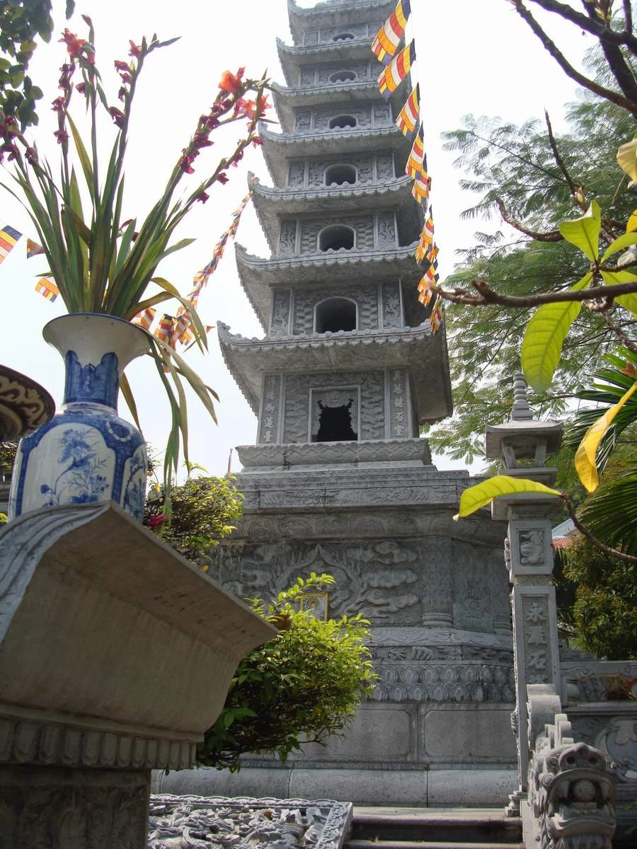 Năm bậc cấp từ hai cột chính bằng đá bước lên tòa tháp tượng trưng cho “ngũ căn, ngũ lực” của nhà Phật. Trên thân tháp có một cặp rồng lớn, 27 cặp rồng nhỏ và những cánh phượng uốn mình rất hoành tráng.