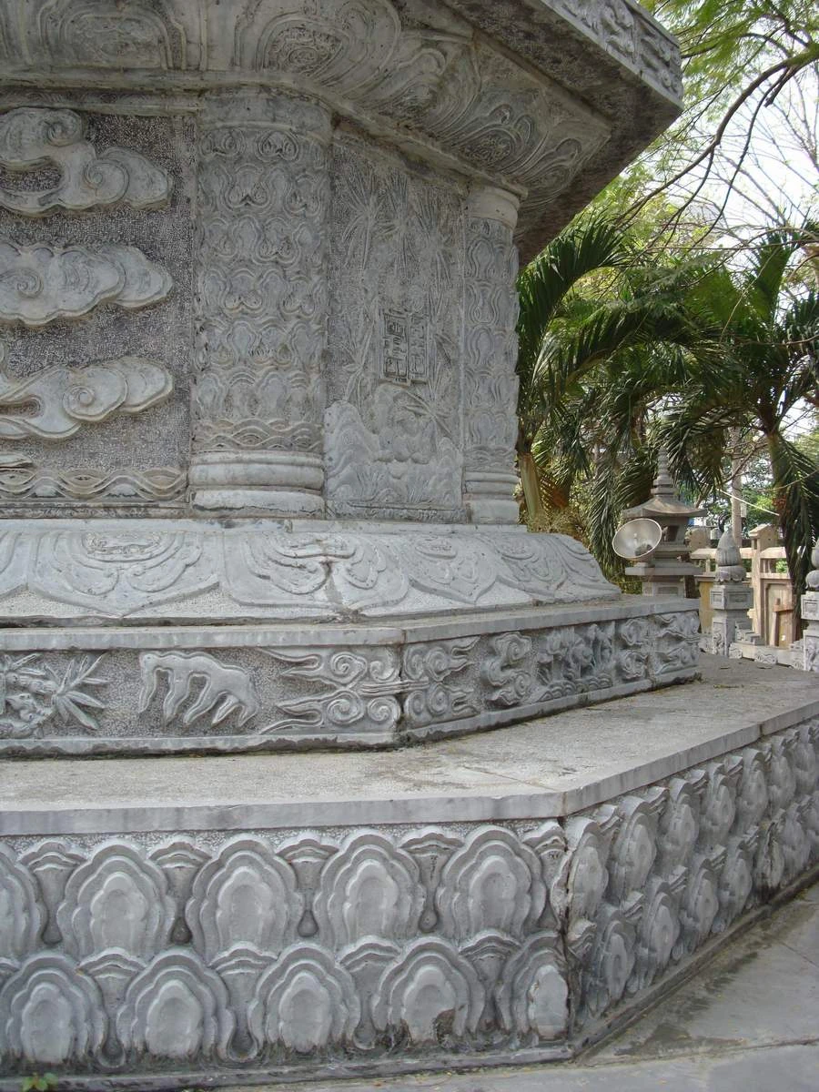 Trên từng tầng tháp là hàng ngàn những cánh sen, hoa sen, thủy ba (sóng nước), lá đề, dơi, câu đối, câu chú...