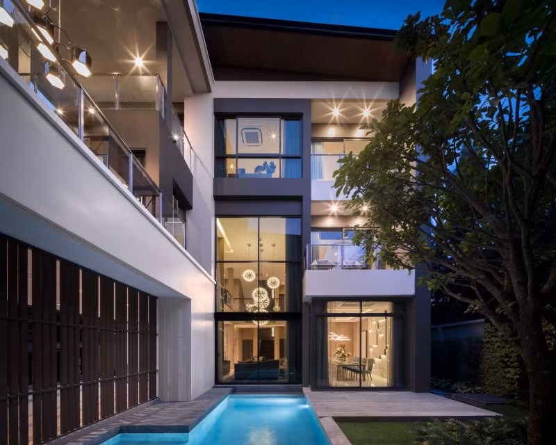 Phía bên hông còn lại là hồ bơi hình chữ nhật, “giải nhiệt” cho công trình.