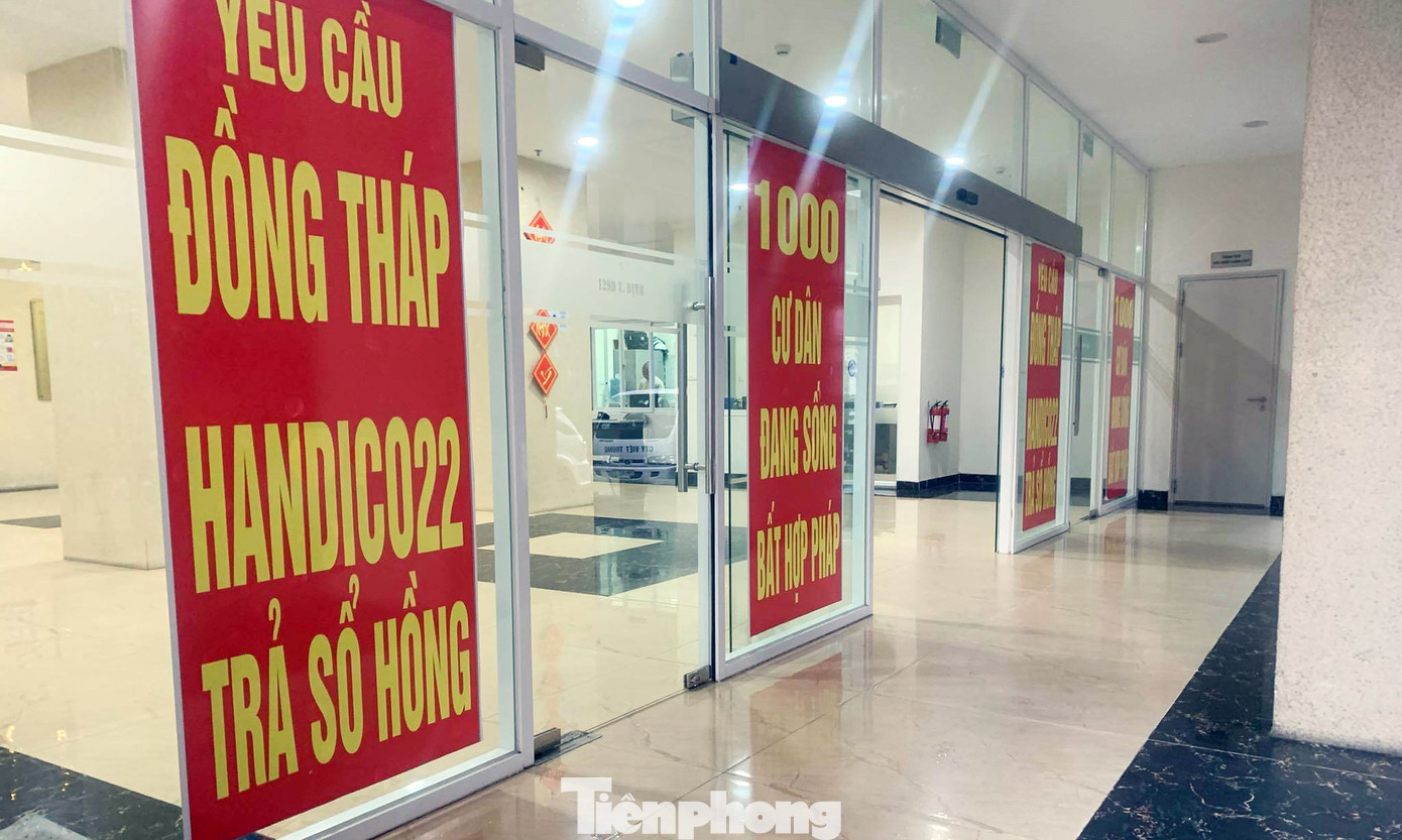 Băng rôn đỏ rực với dòng chữ "Yêu cầu Đồng Tháp, Handico 22 trả sổ hồng", "1000 cư dân không được nhập hộ khẩu", "1000 cư dân đang sống bất hợp pháp"... được cư dân treo khắp khu chung cư.