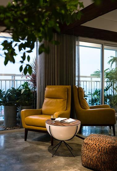 Việc chọn các chất liệu quen thuộc như da, gỗ giúp diện mạo phòng khách trở nên thân thiết hơn với người dùng. Bên ngoài ban công cũng là một kỳ công của đội ngũ thiết kế khi họ tạo ra khu vườn sống động thật sự.