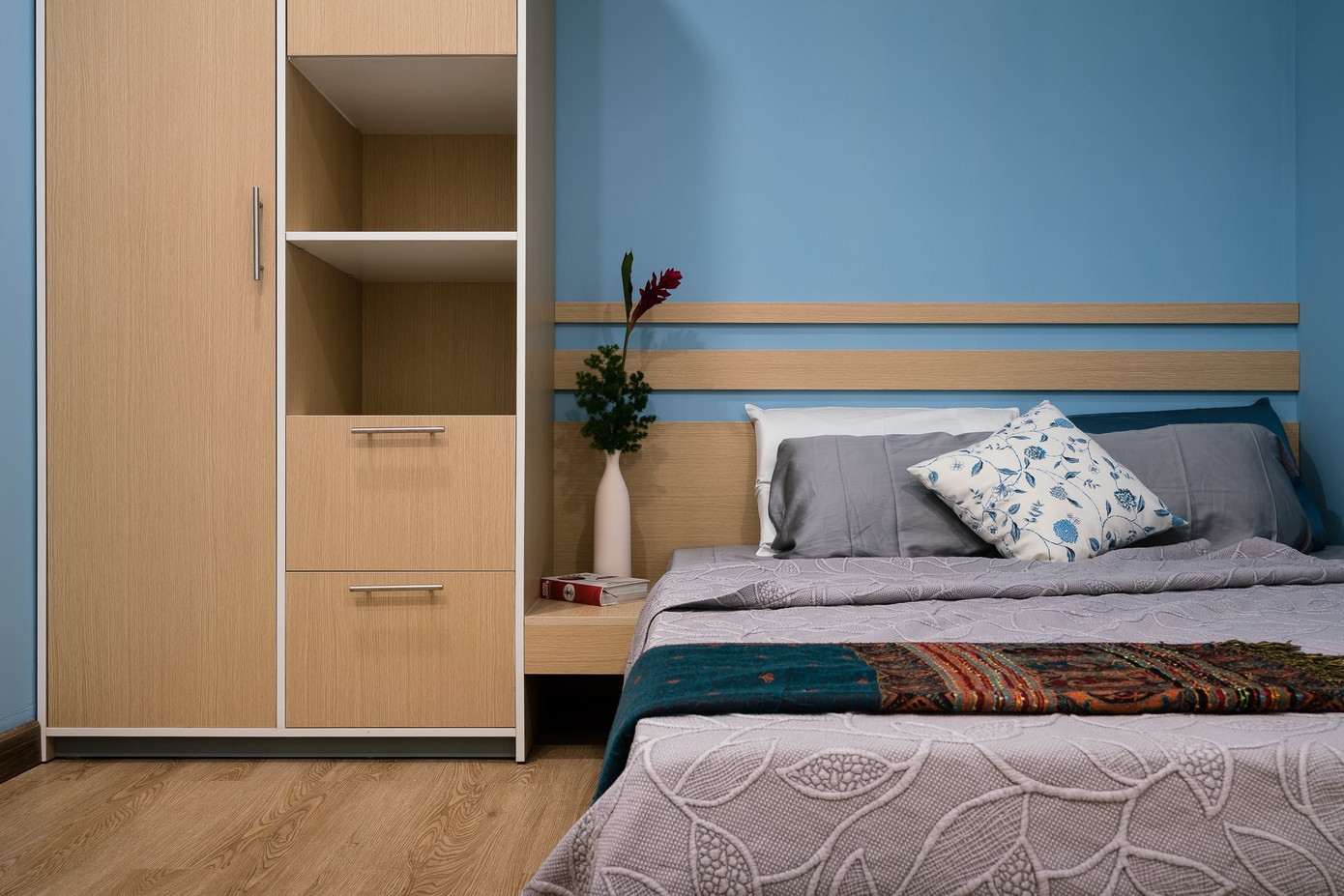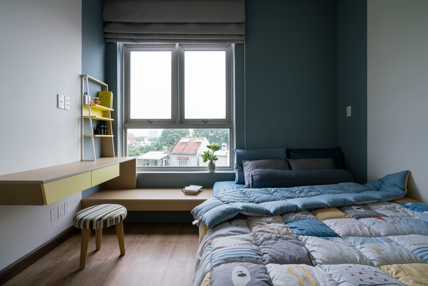 Phòng ngủ thứ nhất với sắc xanh dương mát mắt.