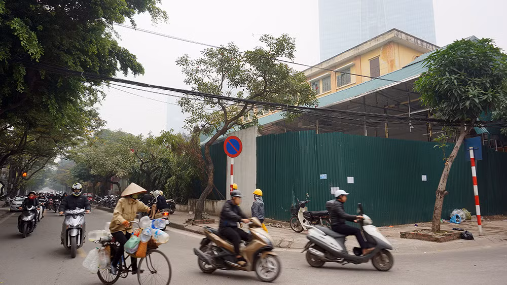 Một số công trình không rõ là đang tháo dỡ hay sửa chữa, lắp đặt mới phía sau tường rào quây tôn kín mít.