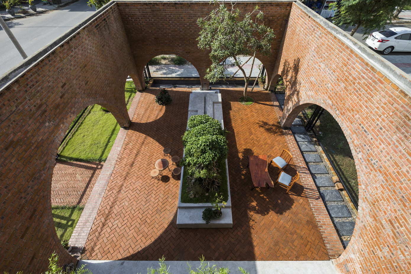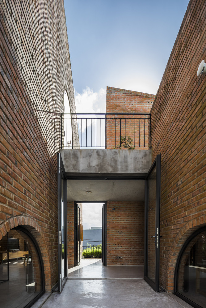 Điểm nhấn của ngôi nhà là ánh sáng lọc qua các cửa hình vòm và các đường cắt gạch tạo ra các dải sáng tối hài hòa.