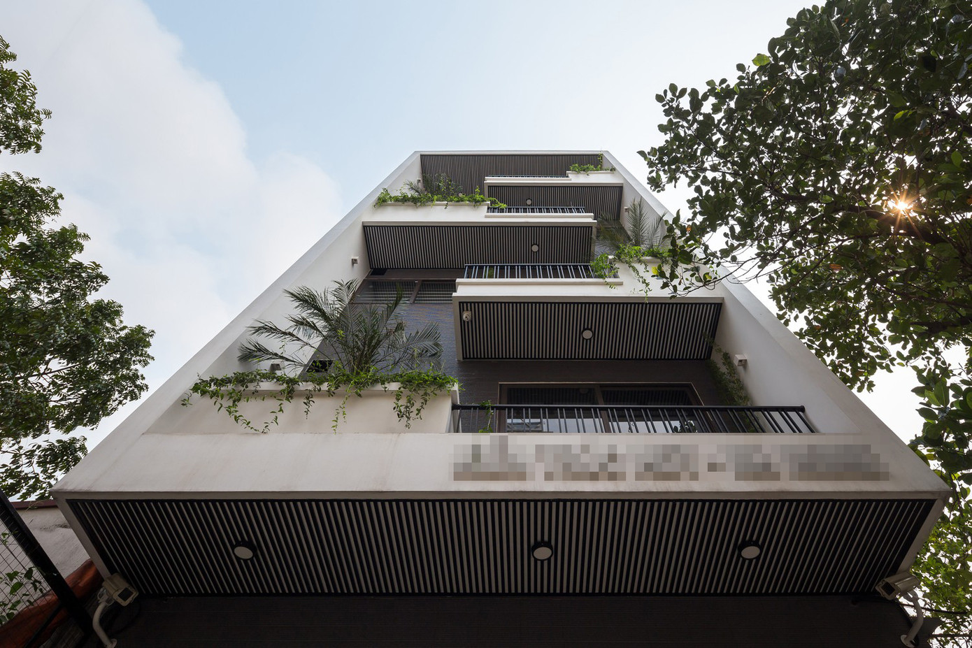 Để giải quyết vấn đề an ninh, khói bụi, và tiếng ồn của nhà phố, nhóm kiến trúc sư tạo ra một khoảng lùi để bố trí cây xanh nằm đan xen trước mặt tiền.