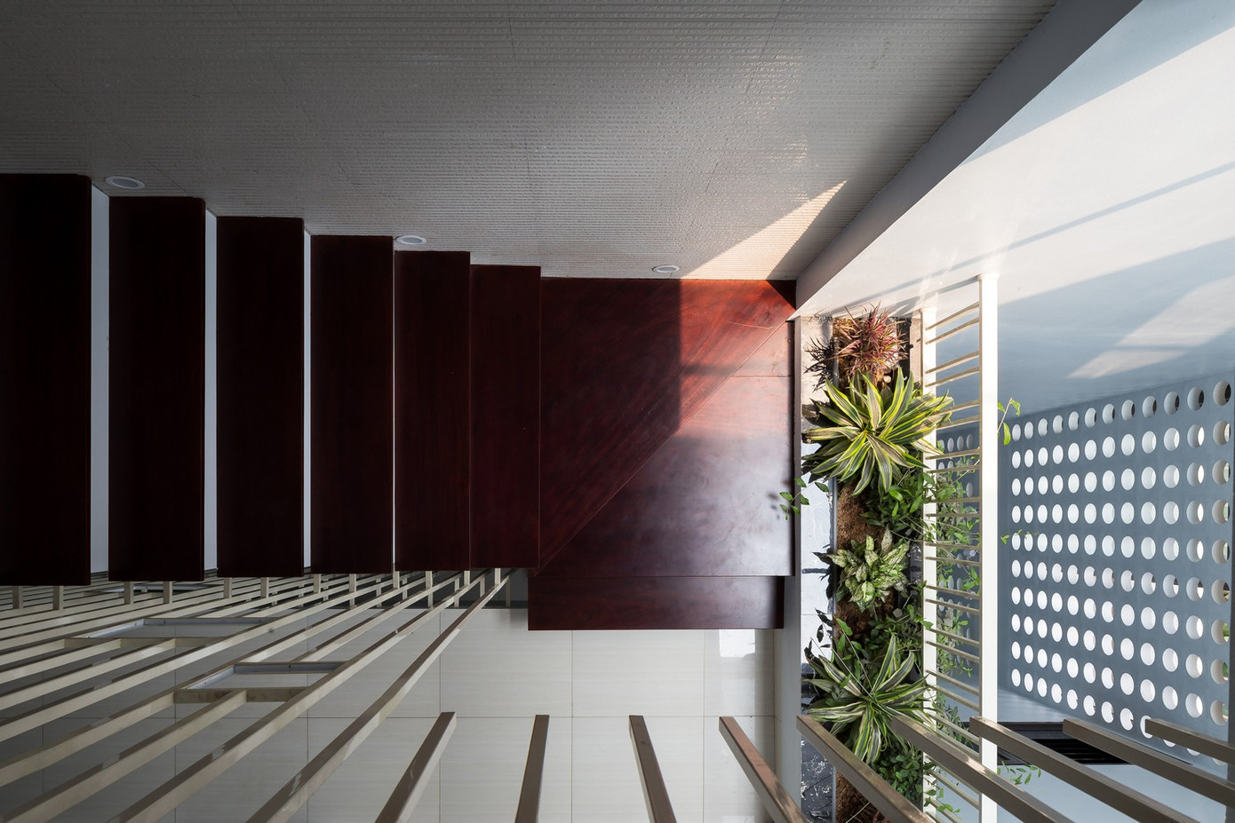 Khoảng trống sau nhà nằm cạnh cầu thang kết hợp với mảng tường gạch bông gió giúp hạn chế ánh nắng, đảm bảo riêng tư và an ninh cho ngôi nhà.