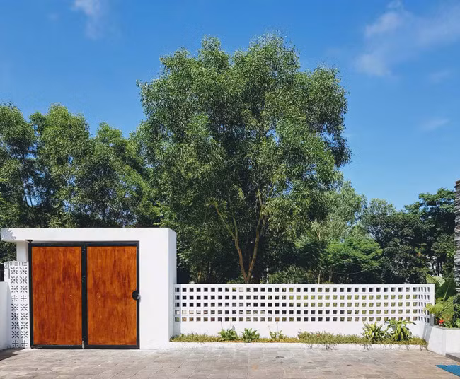 Cổng rào bằng gỗ mang vẻ đẹp gần gũi, giản dị kết hợp cùng gạch thông gió cho cảm nhận tươi mát khi cộng hưởng cùng mảng xanh của cây cối trong khuôn viên ngôi nhà.
