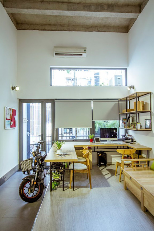 Ở tầng trệt thiết kế thành phòng làm việc thay vì phòng khách. Với bàn, ghế dành cho 3 người. Bố mẹ có thể vừa làm việc vừa giám sát việc học tập của con cái.