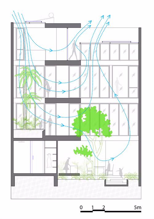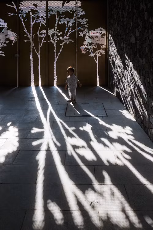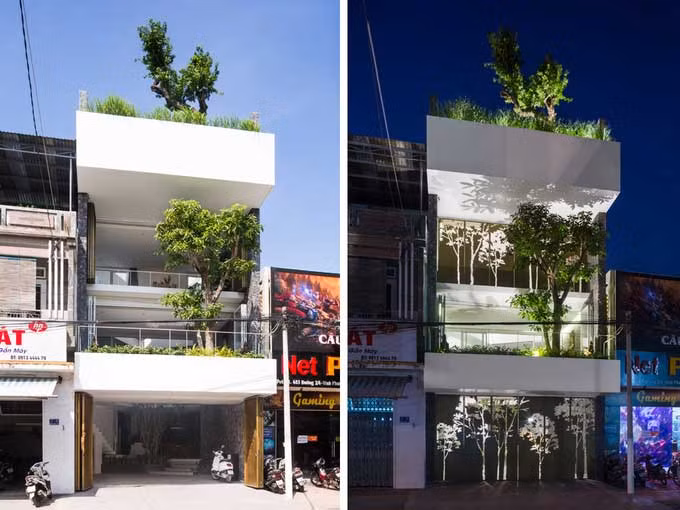 Công trình không chỉ thu hút vào ban ngày với những mảng cây xanh dịu mát khắp các tầng mà còn bắt mắt ngay cả lúc đóng cửa hoặc khi màn đêm buông xuống. Những khung cửa sắt đục lỗ hình cây tạo ra bóng đổ lung linh vào mọi thời điểm trong ngày.