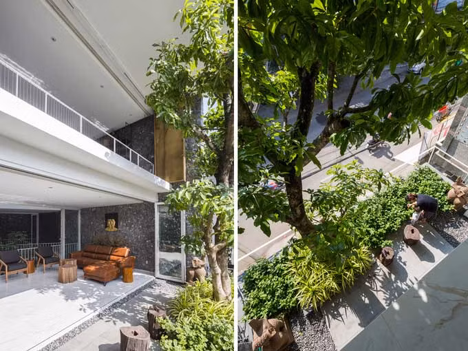 Phần mái hiên rộng cùng khoảng đệm cây xanh giúp gia chủ có thể thường xuyên rộng mở cửa đón nắng gió.