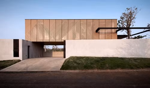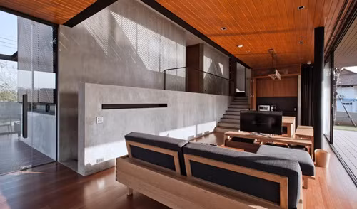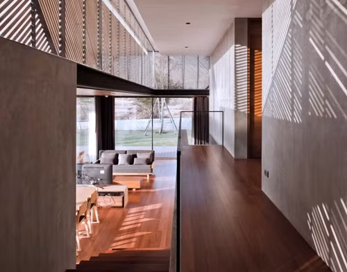 Ngôi nhà được bao bọc bởi những mảng gỗ chéo, vừa tạo sự riêng tư, vừa lấy ánh sáng tự nhiên khắp các phòng.