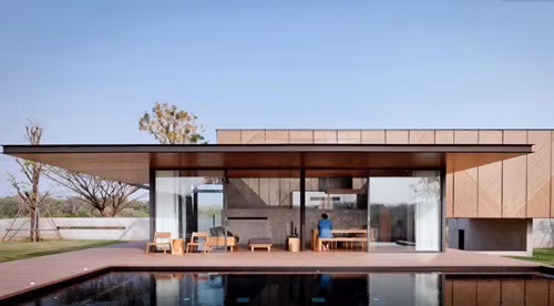 Không gian mở phía sau vô cùng hút mắt với sảnh rộng và bể bơi.