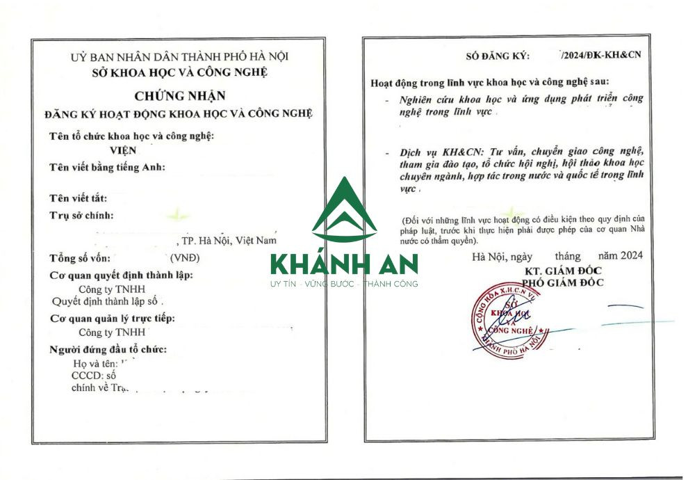 Khánh An cam kết cung cấp dịch vụ uy tín và giá cả hợp lý trong việc thành lập Viện nghiên cứu, Trung tâm nghiên cứu khoa học công nghệ. Khánh An hỗ trợ khách hàng toàn bộ quá trình thành lập, bao gồm các dịch vụ chính sau: