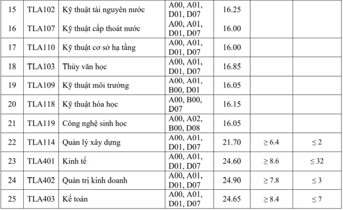 Tối 15/9, Đại học Thủy lợi công bố điểm chuẩn vào 31 ngành và nhóm ngành tại trụ sở chính Hà Nội. Công nghệ thông tin tiếp tục lấy cao nhất, tăng 2,5 điểm so với năm ngoái. Quản trị Kinh doanh lấy 24,9 điểm, nhiều ngành lấy từ 24 trở lên gồm Hệ thống thông tin, Kỹ thuật phần mềm, Kinh tế, Logistics và Quản lý chuỗi cung ứng...