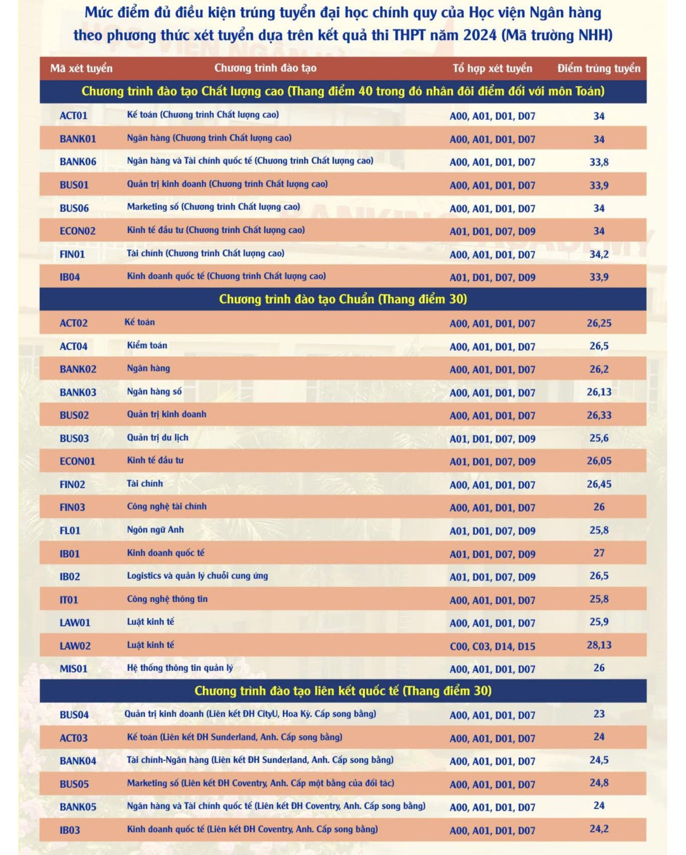 Xét thang điểm 40 (môn Toán nhân hệ số 2), ngành Tài chính có điểm trúng tuyển cao nhất với 34,2 điểm, trung bình thí sinh phải đạt 8,5 điểm một môn. Điểm trúng tuyển các ngành của Học viện Ngân hàng năm 2024 như sau:
