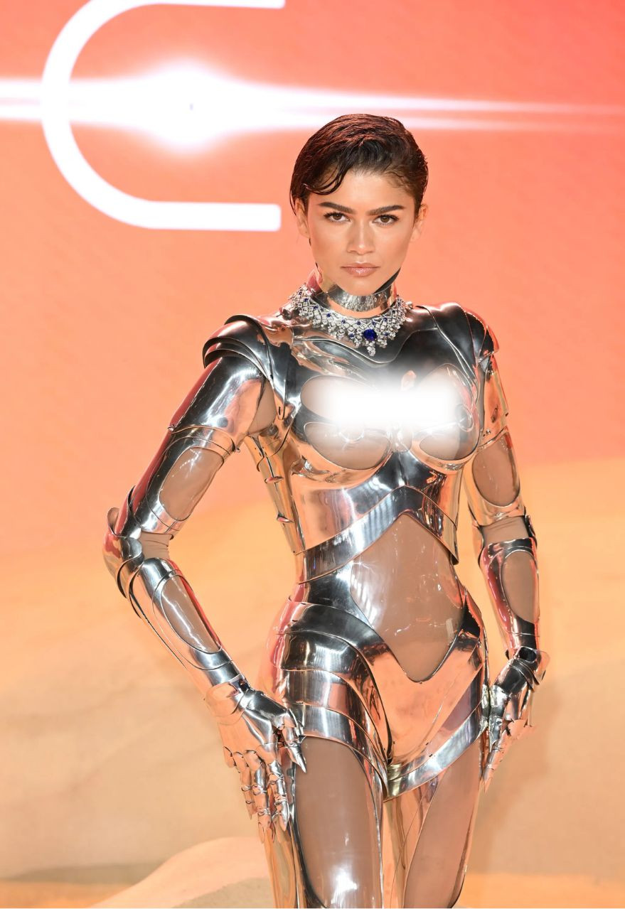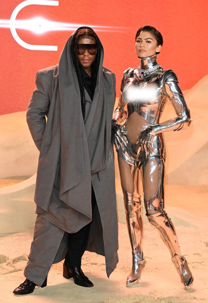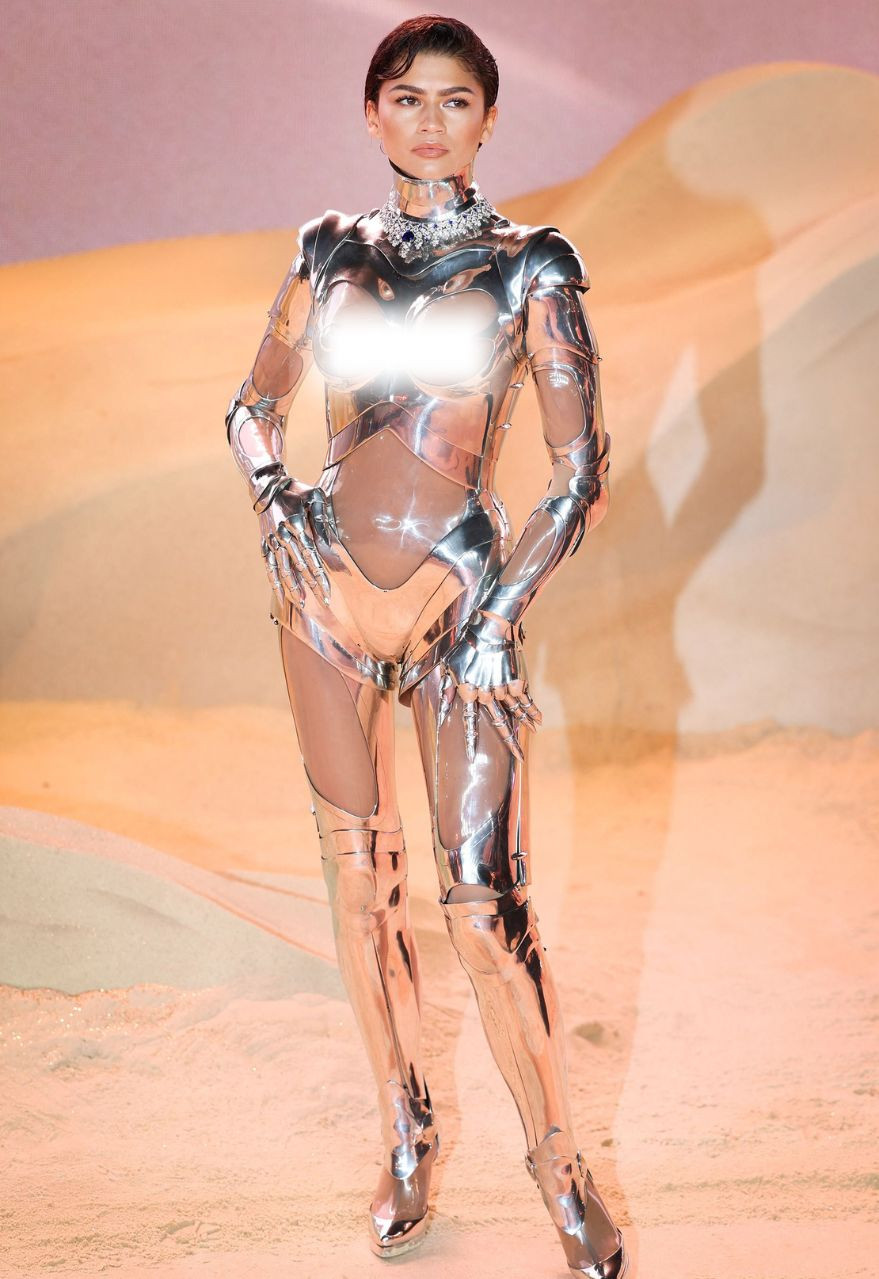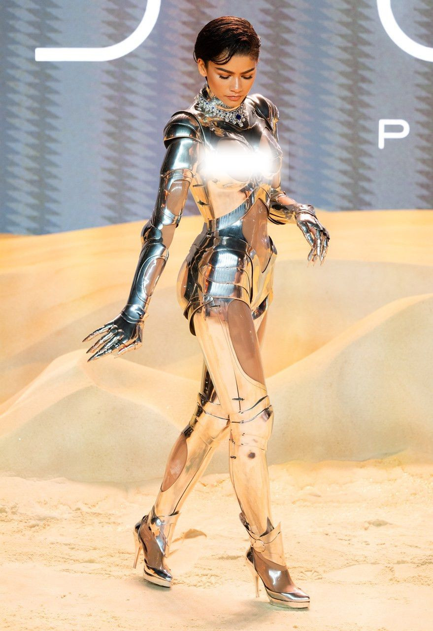 Zendaya thu hút mọi ánh nhìn trong trang phục robot kim loại ôm sát vừa vặn, tích hợp cả giày cao gót. Các chi tiết cắt xẻ độc đáo ở ngực, đùi, bụng, cánh tay tôn lên sắc vóc của nữ diễn viên 27 tuổi.