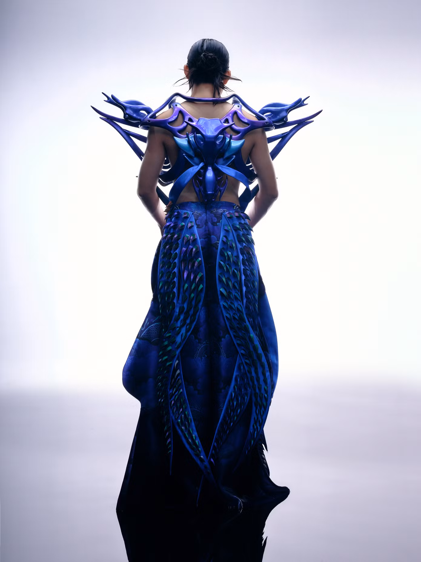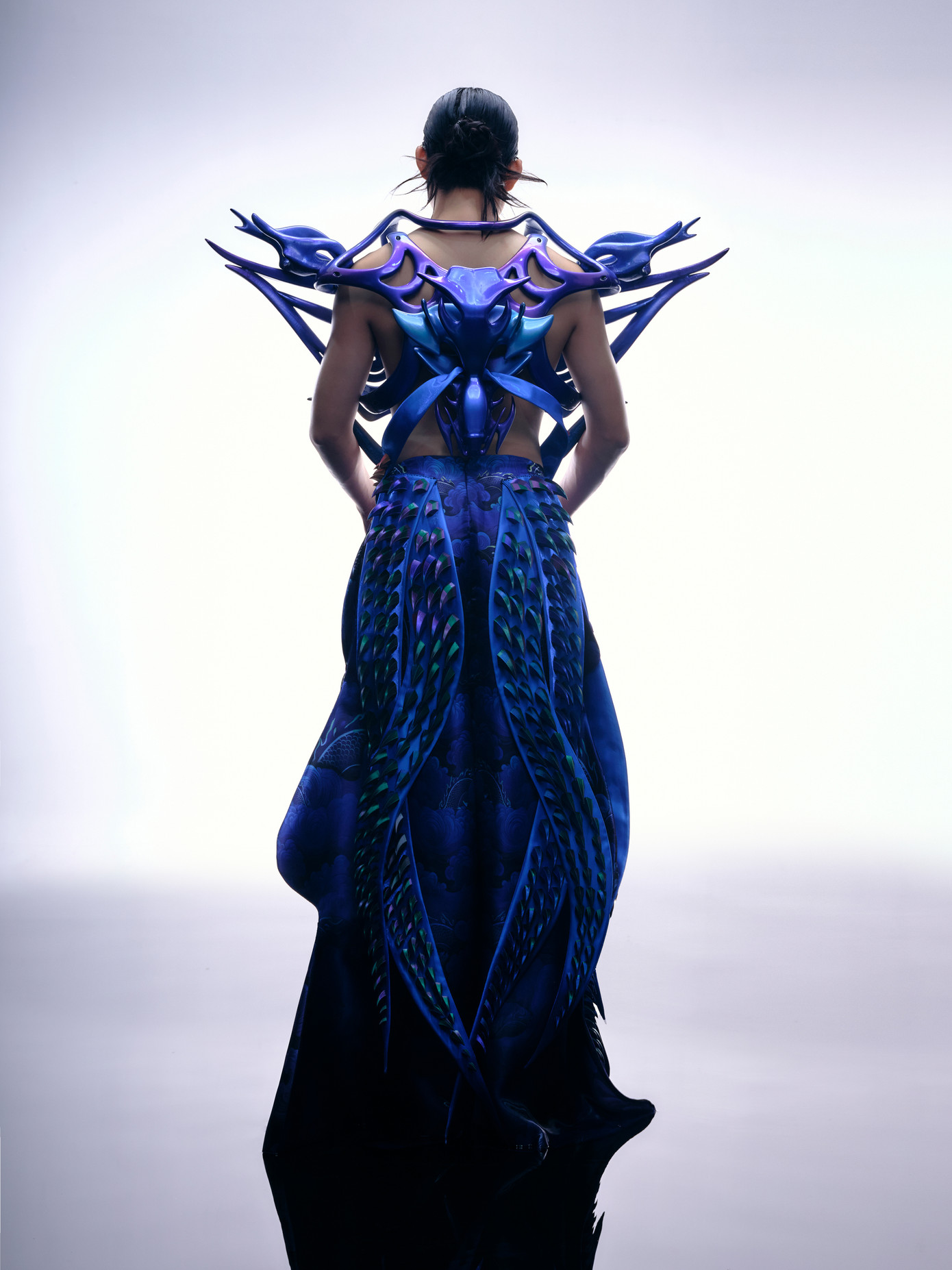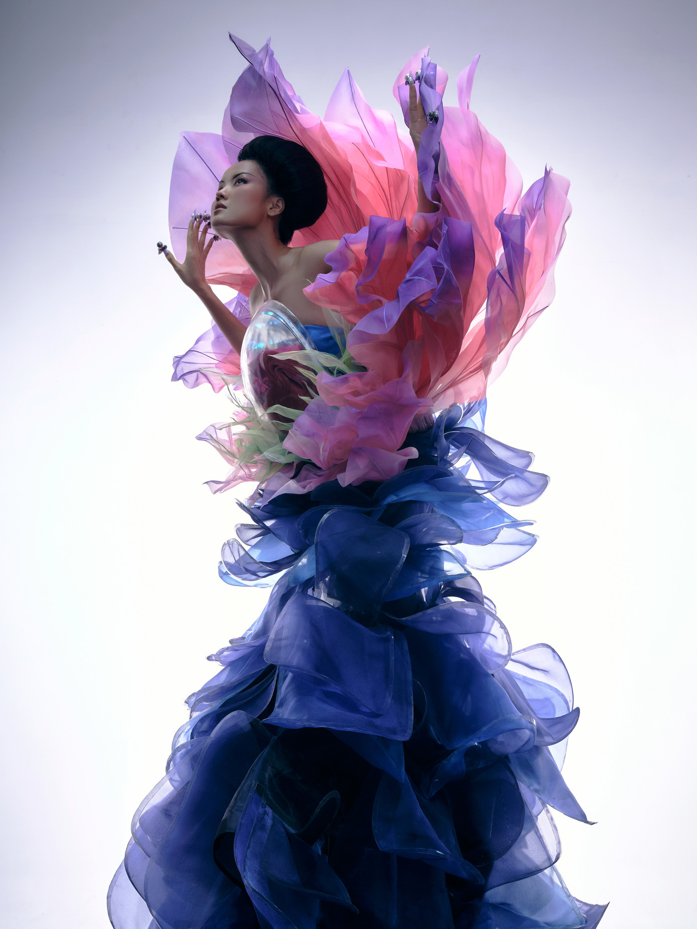 Các thiết kế trong BST Cội là sự kết hợp giữa kỹ thuật hiện đại in 3D, hiệu ứng động - Kinetic… để tạo ra những thiết kế siêu thực, mới lạ từ hình tượng dân gian quen thuộc.