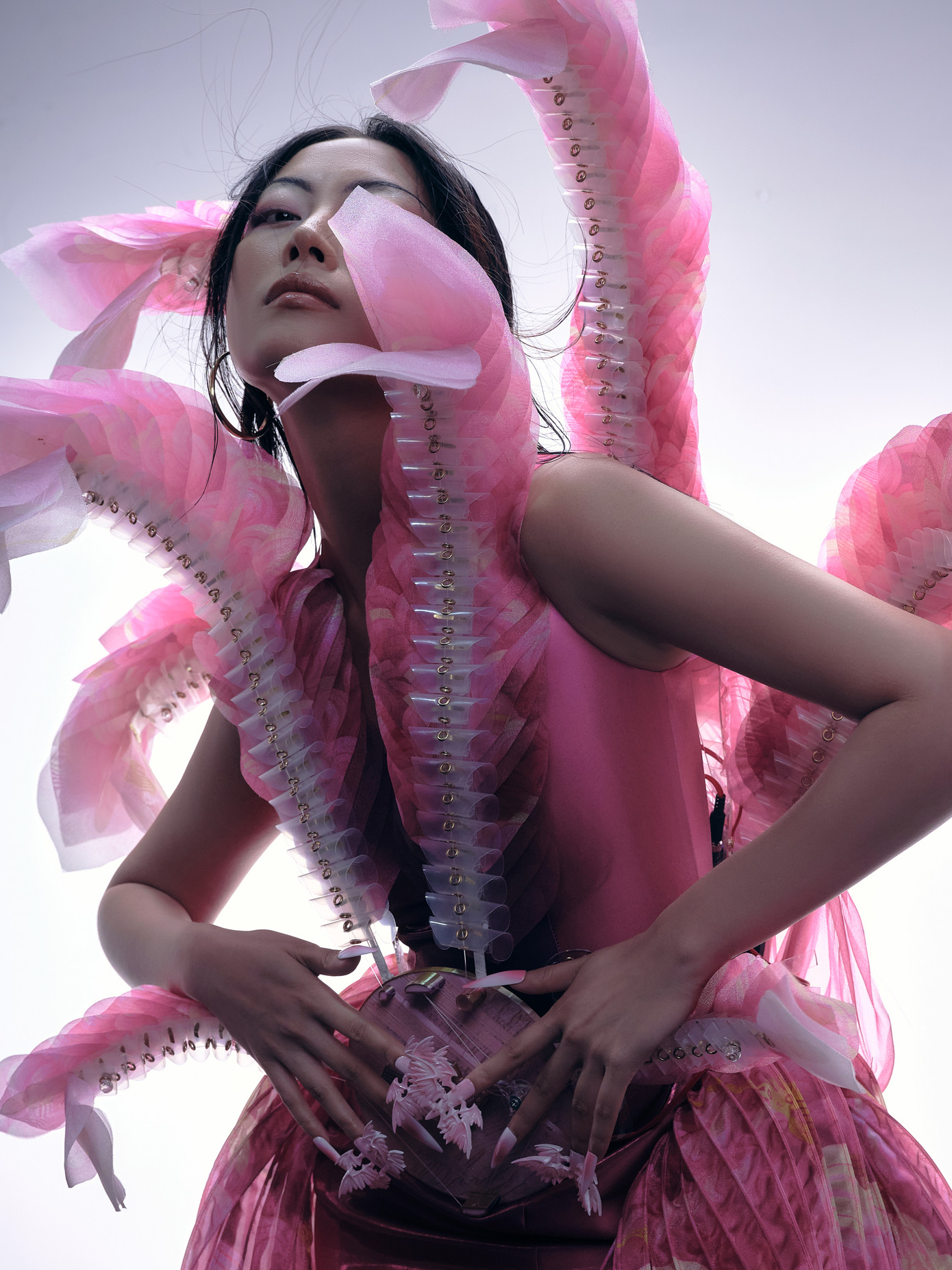 Chia sẻ với Hoa Học Trò Online về việc lựa chọn một hình tượng dân gian cho đồ án tốt nghiệp, Jang Tao cho biết: “Đồ án đầu tiên tôi từng thực hiện là tác phẩm lấy cảm hứng từ hình ảnh rồng thời Lý trong văn hóa Việt. Tôi muốn tạo ra kết cấu đầu cuối tương ứng. Vì thế, tôi khép lại quãng thời gian sinh viên bằng BST Cội lấy cảm hứng từ truyền thuyết Con Rồng Cháu Tiên”.