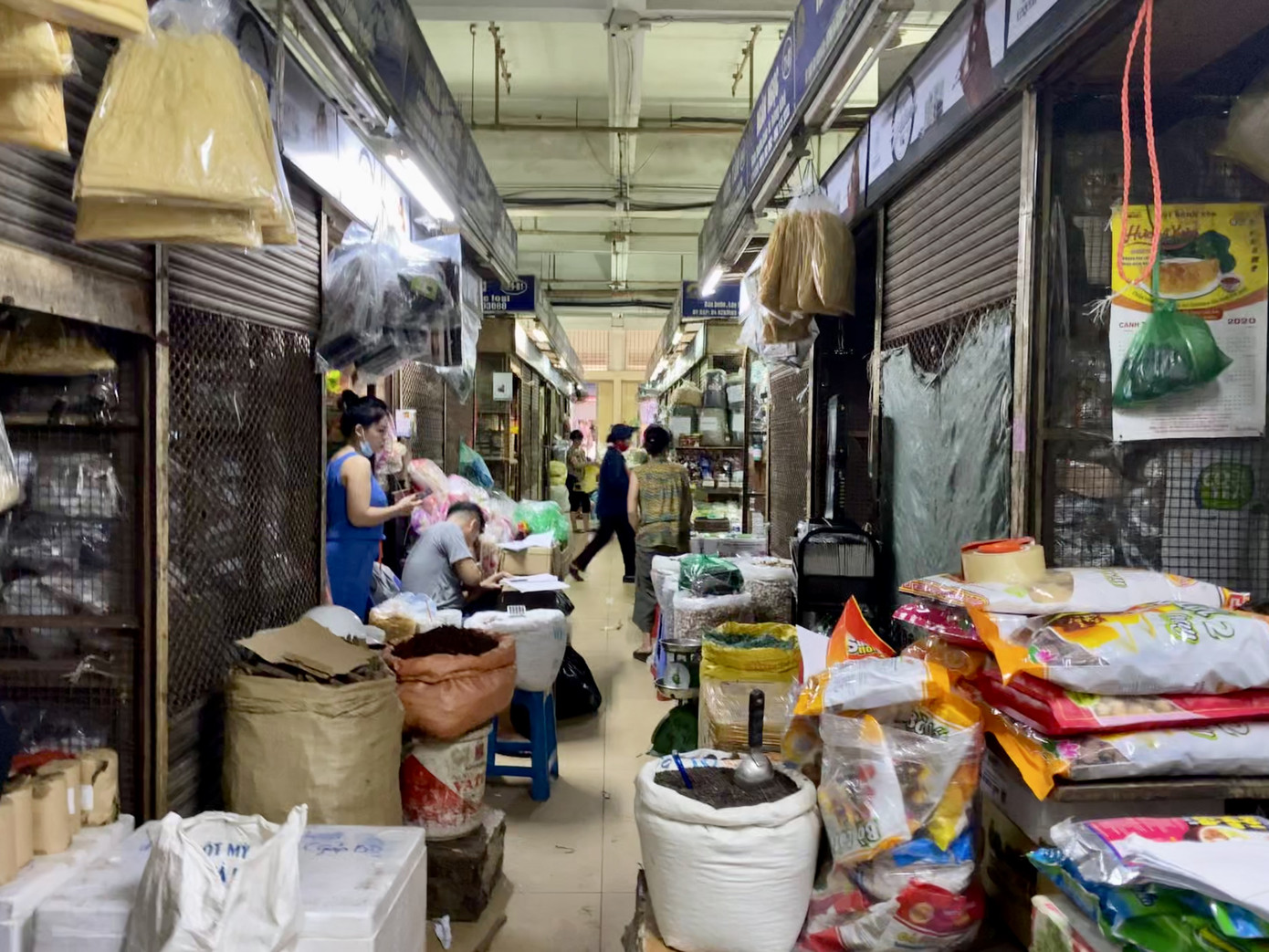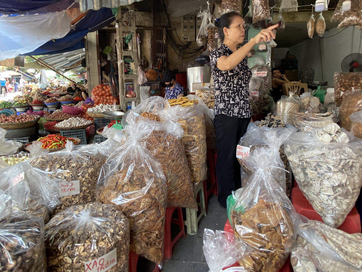 Một hàng dài các kiot bán đồ chay nằm lọt thỏm ở tầng 1 chợ Đồng Xuân chủ yếu phục vụ khách sỉ, trong đó, có tiếng nhất là quầy S.T nằm ngay đầu dãy.Hàng hoá để la liệt, kê kín quây lấy lối đi, không gian chật hẹp bao trùm là một mùi hỗn tạp của các nguyên liệu khô đặc trưng bày bán tại đây
