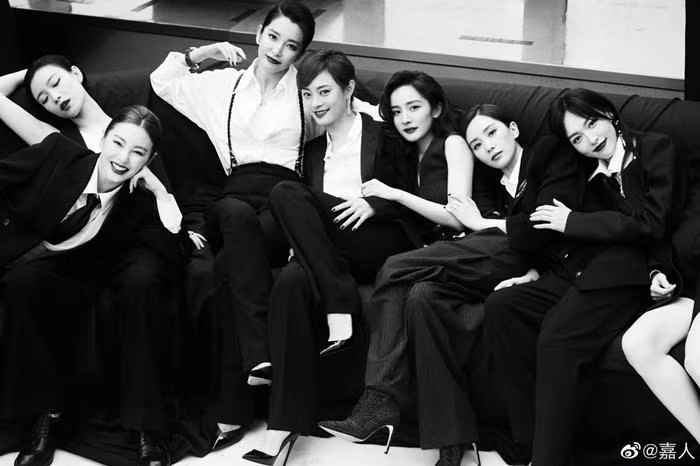 Ở look thứ 2 khi chụp ảnh cùng hội chị em “soái tỷ”, Dương Mịch mặc một chiếc quần tây ống rộng, áo ghile đen, tóc xoăn xõa cực kỳ nữ tính.