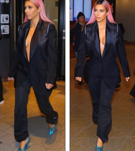Kim "siêu vòng ba" nhuộm tóc hồng nổi bật, diện bộ suit đen và táo bạo với mốt không nội y.