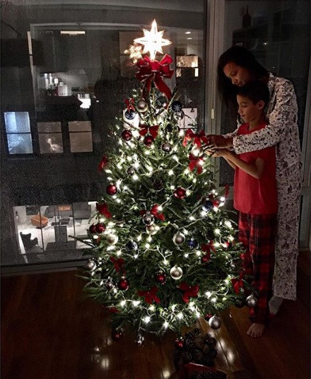 Nàng mẫu đơn thân Lais Ribeiro cùng con trai điểm tô cho cây thông lấp lánh.