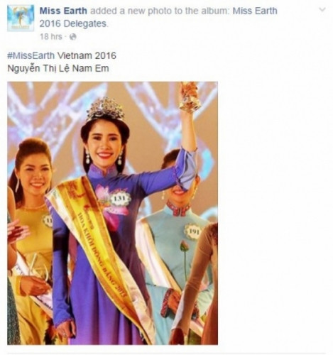 Mới đây, trên fanpage Hoa hậu Trái đất (Miss Earth 2016) thông báo đại diện của Việt Nam góp mặt tại đấu trường nhan sắc này là Hoa khôi Nguyễn Thị Lệ Nam Em. Cuộc thi sẽ diễn ra vào tháng 10 tới tại Philippines.