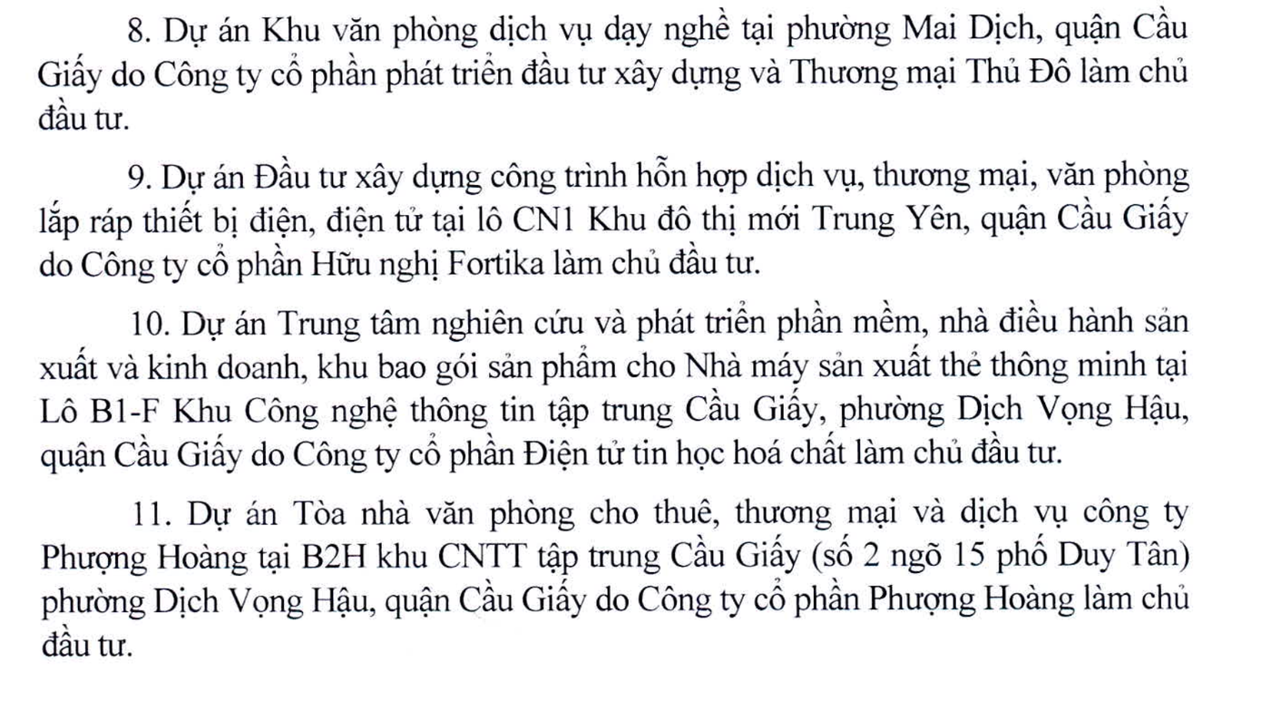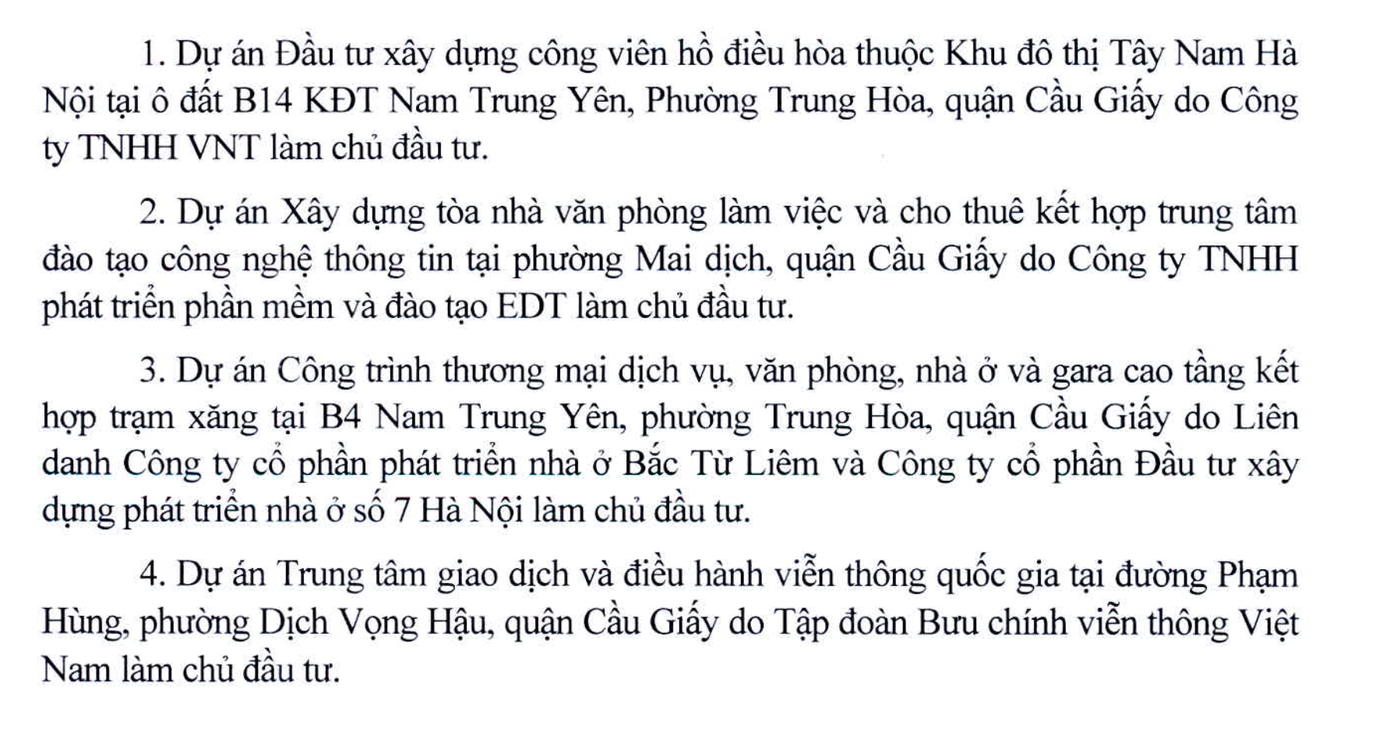 Đối với 3 dự án còn lại là Dự án Xây dựng Toà nhà hỗn hợp văn phòng, dịch vụ và nhà ở để bán Skyline tại số 5 Lạc Long Quân, phường Nghĩa đô do Công ty khảo sát xây dựng USCO làm chủ đầu tư; Dự án Trung tâm đào tạo, bồi dưỡng cán bộ, văn phòng và nhà công vụ tại ô đất A/D18, KĐT mới Cầu Giấy, phường Dịch Vọng do Ngân hàng phát triển Việt Nam làm chủ đầu tư; Dự án Tháp tài chính quốc tế - IFT tại số 220 Trần Duy Hưng, phường Trung Hoà do Tổng Công ty Bảo Việt Nhân thọ - thuộc Tập đoàn Bảo Việt làm chủ đầu tư. Chủ tịch UBND TP Hà Nội cho biết, đây là các cơ quan thuộc thẩm quyền sắp xếp cơ sở nhà đất của Bộ Tài chính. Giao Sở Tài chính phối hợp, liên hệ với cơ quan chuyên môn của Bộ tài chính về phương án sắp xếp, xử lý tài sản công, thông tin gửi Sở TNMT trước ngày 15/7/2023.