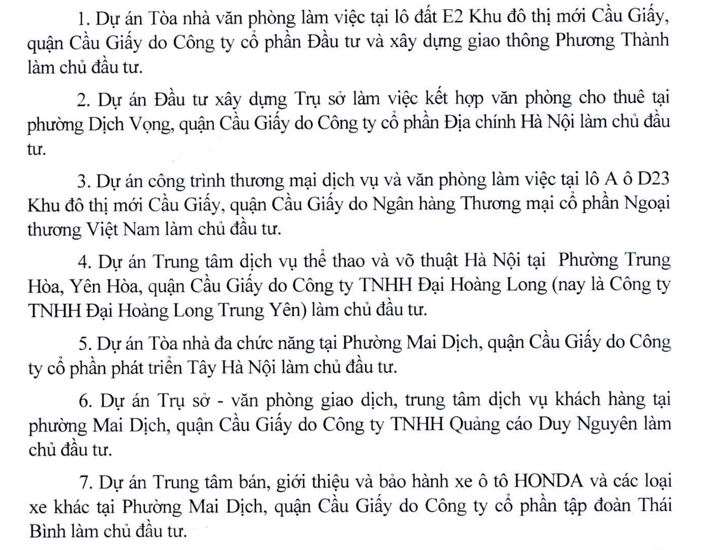 Theo báo cáo của Sở Tài nguyên và Môi trường Hà Nội (TNMT), trên địa bàn quận Cầu Giấy có 50 dự án vốn ngoài ngân sách chậm tiến độ thực hiện. Trong đó có 29 dự án thuộc Danh mục 404 (dự án được Nhà nước giao đất, chuyển đổi mục đích sử dụng đất) và 21 dự án thuộc Danh mục 173 (dự án các quận, huyện đề xuất).