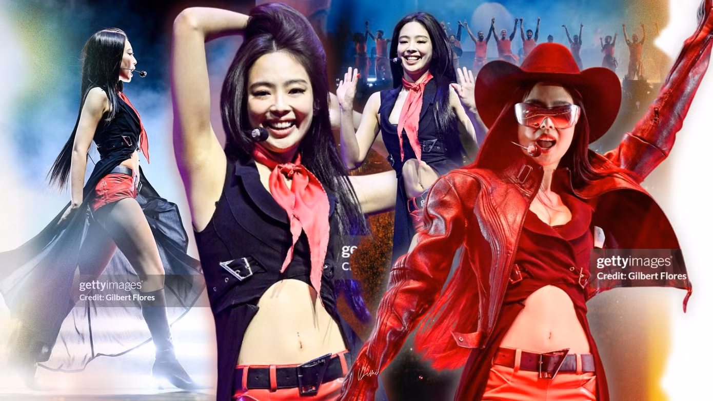 Jennie đem tới Coachella 2025 tạo hình mang đậm dấu ấn cá nhân. Gam màu đỏ đen quyền lực hay trào lưu gấp ba thắt lưng/ triple belt, micro short (quần một gang) yêu thích của IT Girl xứ Hàn "chiếm spotlight" tại đại nhạc hội.