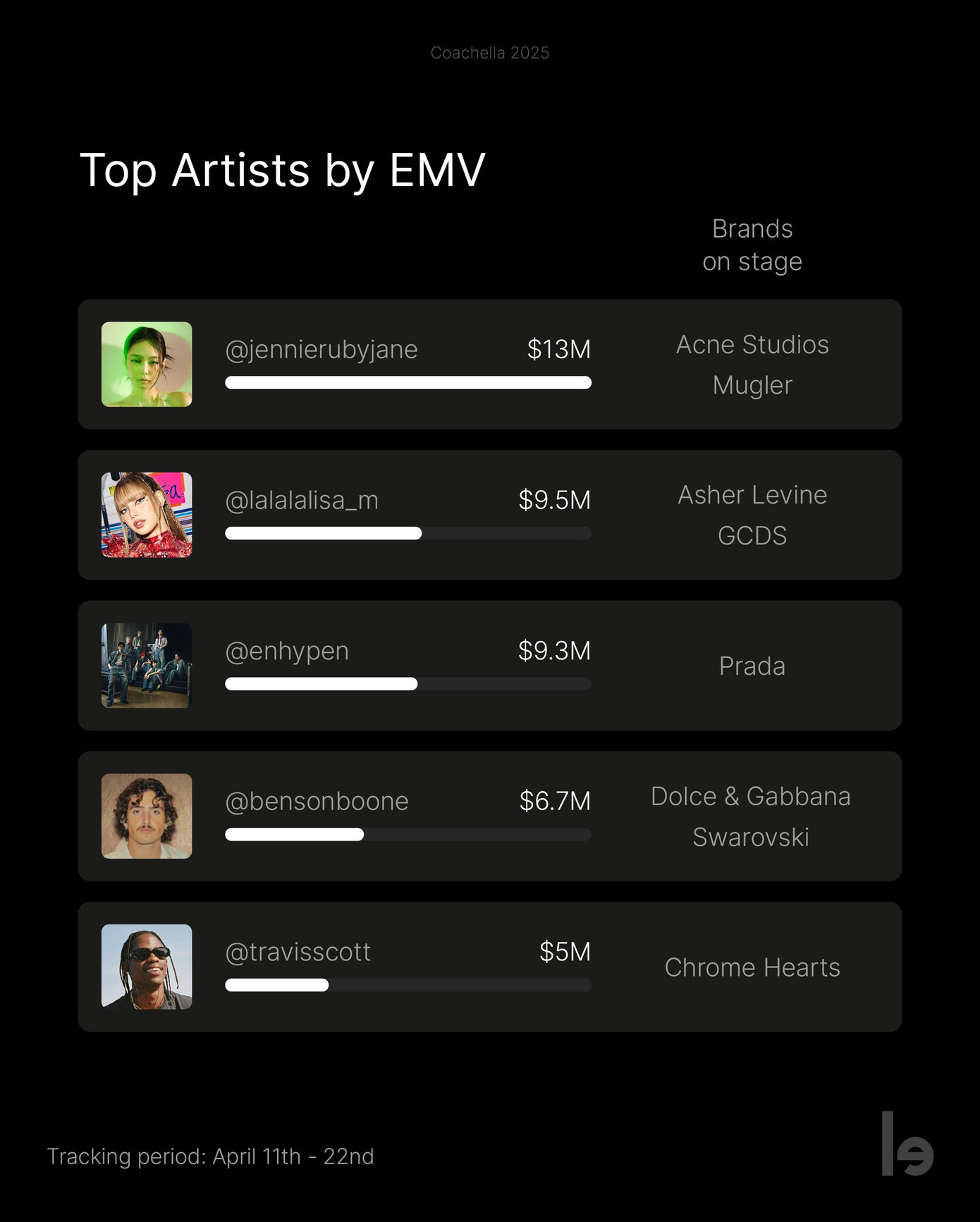 Trang web phân tích phương tiện truyền thông và thời trang/ người có sức ảnh hưởng Lefty mới đây công bố danh sách những nghệ sỹ đem lại giá trị truyền thông (EMV) lớn nhất trong đại nhạc hội Coachella 2025.