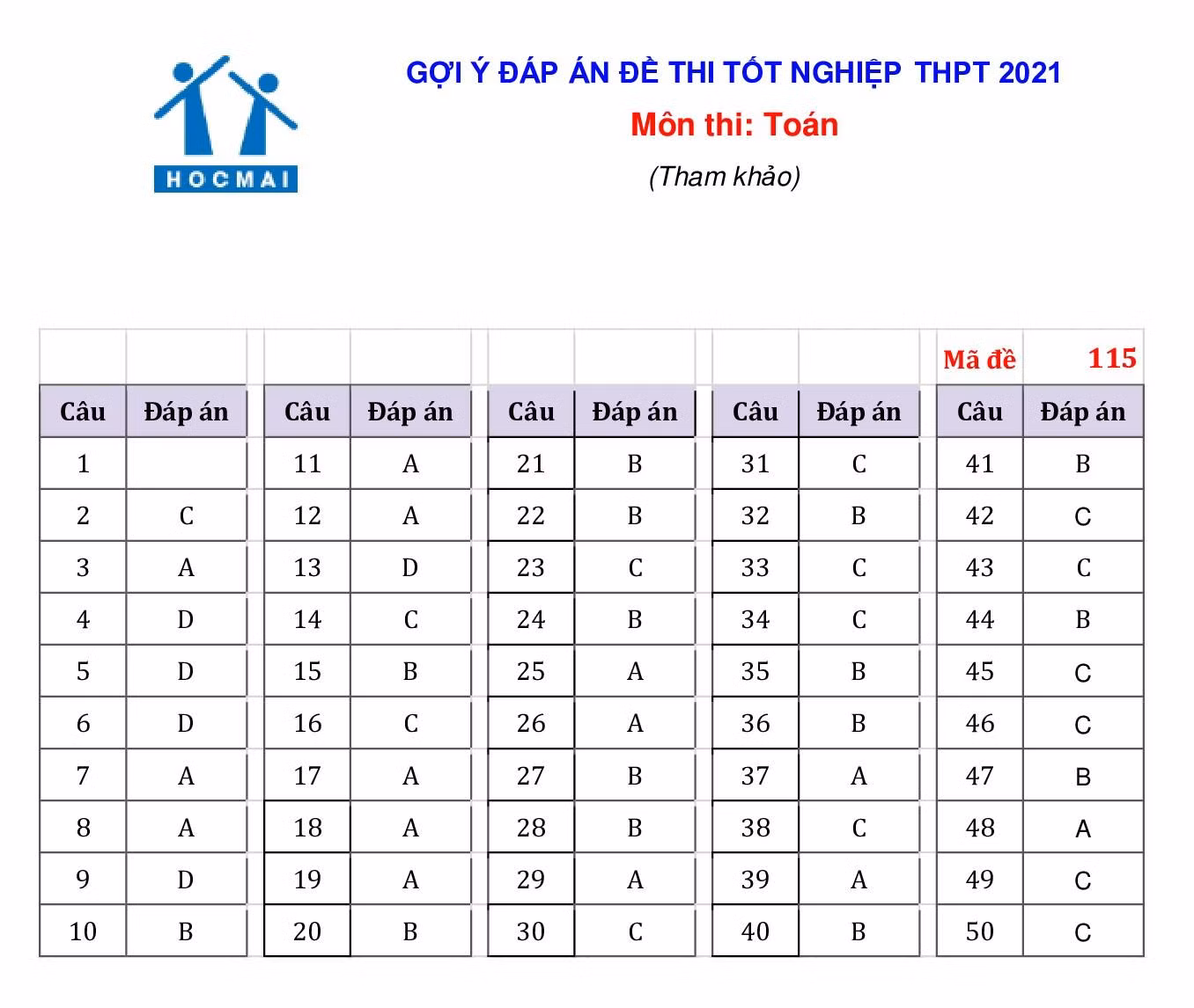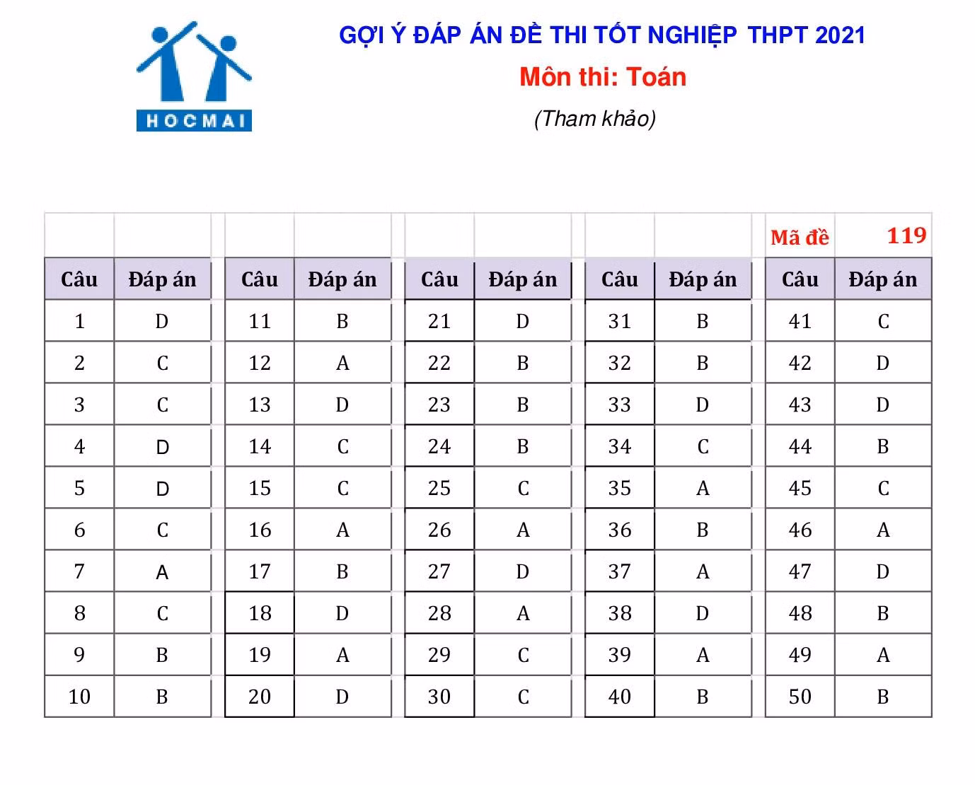 Gợi ý đáp án 4 mã đề 119, 121, 105 và 115 như sau: