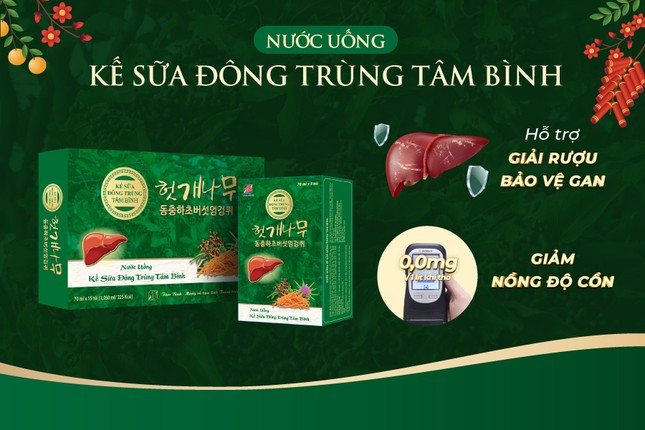Kế sữa Đông trùng Tâm Bình là giải pháp tối ưu giúp giải rượu bia. Trước khi uống rượu bia 30 phút, sử dụng 1 gói Kế sữa Đông trùng Tâm Bình sẽ giúp tăng chuyển hóa cồn, giải rượu và hỗ trợ bảo vệ cơ thể khỏi những tác động tiêu cực của bia rượu. Trường hợp uống “quá chén”, nên dùng thêm 1 gói sau cuộc nhậu giúp cơ thể nhanh phục hồi, giảm mệt mỏi, mau tỉnh táo để không bỏ lỡ các hoạt động vui chơi ngày Tết.