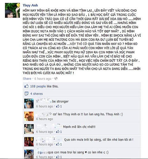 Mình không có trách ai và cũng không cần ai phải nuôi con mình với lời lẽ quá tàn nhẫn như thế, xúc phạm người phụ nữ sinh ra con mình và xúc phạm luôn đứa con của mình, biết hậu quả mà vẫn làm chỉ vì bảo vệ cho riêng bản thân của mình mà thôi, mọi việc nên chấm dứt tất cả ở đây. Bao nhiêu đó là quá đủ, những con người nào không có lương tâm thì trong khi người ta đau đớn nhất thì vẫn cho là người ta đang diễn... Nhìn thói đời mà cười ra nước mắt!".