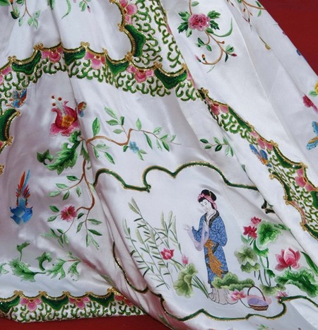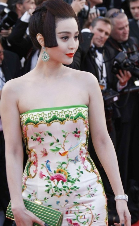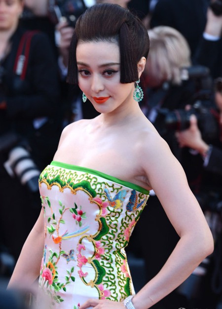 Lần này, cô nàng có mái tóc được vấn độc đáo, tô son môi màu cam, khuyên tai màu cẩm thạch. Đặc biệt, chiếc váy quây của Phạm Băng Băng phải mất tới 4 tháng mới thiết kế và may xong, với những chi tiết thêu tay rất cầu kỳ, sắc sảo.