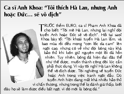 Trong khi đó, rocker Phạm Anh Khoa cho biết: “Em đi đóng phim đúng kỳ EURO, chắc khó mà xem được hết các trận đấu. Tiếc lắm, nhưng biết làm sao được. Chỉ hơi vui là kỳ này phim đang quay ở quê nhà Cam Ranh (Khánh Hòa), nên em được xem bóng đá cùng gia đình”.