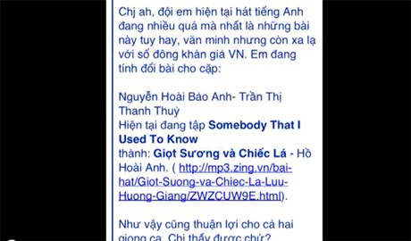 Người thực hiện clip này cũng chụp lại màn hình một email được cho là của huấn luận viên Trần Lập gửi cho Phương Uyên với nội dung xin đổi ca khúc Somebody That I Used To Know thành Giọt sương và Chiếc lá cho cặp đôi của Bảo Anh và Thanh Thùy vì bài hát tiếng Anh này còn xa lạ với số đông khán giả Việt Nam nhưng Phương Uyên không đồng ý và cho rằng Giọt sương và Chiếc lá không đủ "đẳng cấp" để hát trong chương trình này.