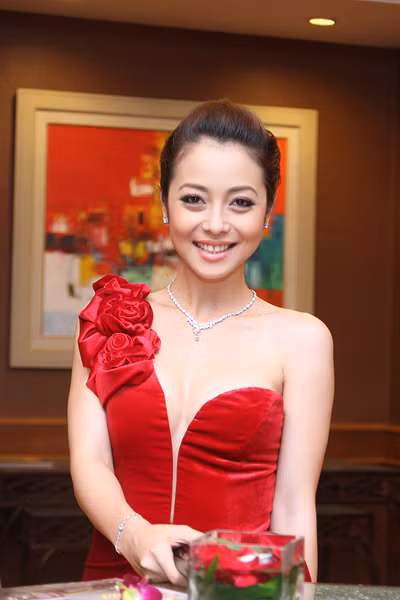 | Diện bộ đầm nhung đỏ lệch vai và khoét sâu vòng 1, Hoa hậu châu Á tại Mỹ khoe khéo đôi gò bồng đảo gợi cảm. |