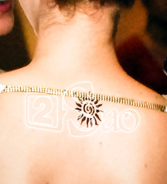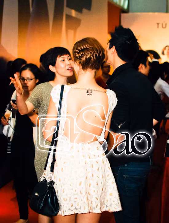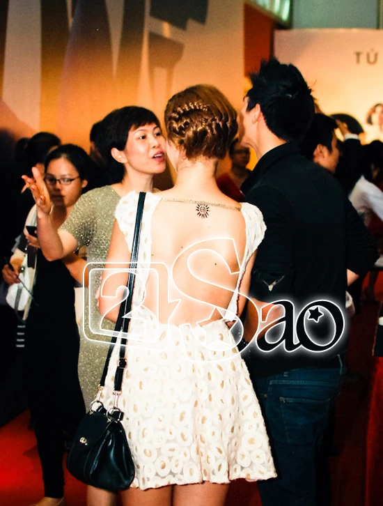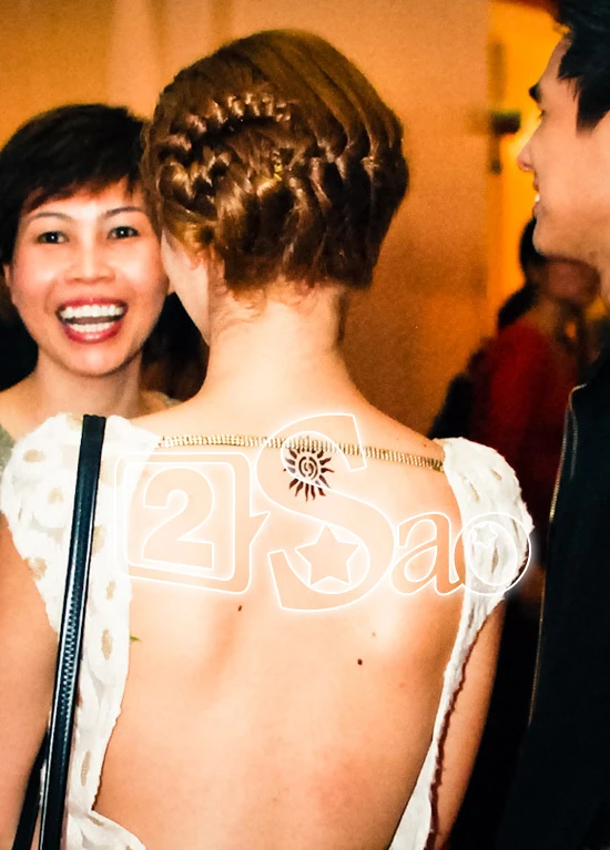 Cô nàng cũng chơi nổi với bộ đầm phía trước kín đáo nhưng phía sau thì khoe nguyên chiếc lưng trần cho hình xăm cách điệu mặt trời to bằng đồng xu ở sau gáy. Xem ra còn rất nhiều điều bất ngờ mà cô nàng sẽ dành cho mọi người mọi người sau này.