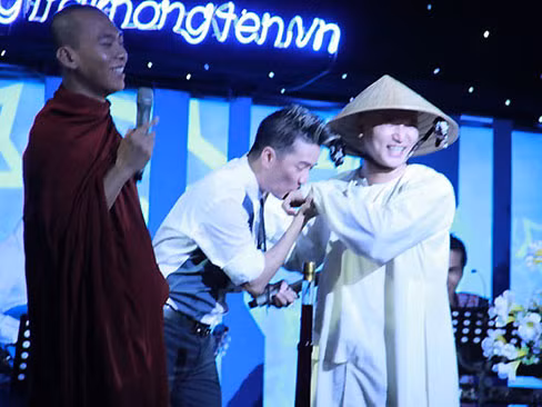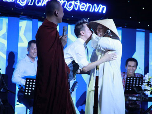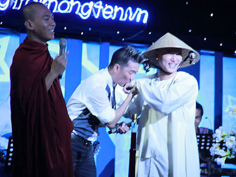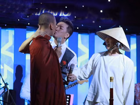 Với 55 triệu đồng để mua chai rượu đấu giá của Đàm Vĩnh Hưng trong đêm nhạc ủng hộ ca sĩ trẻ Wanbi Tuấn Anh, hai nhà sư đã lên sân khấu để nhận rượu và... hôn.