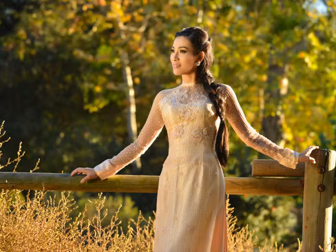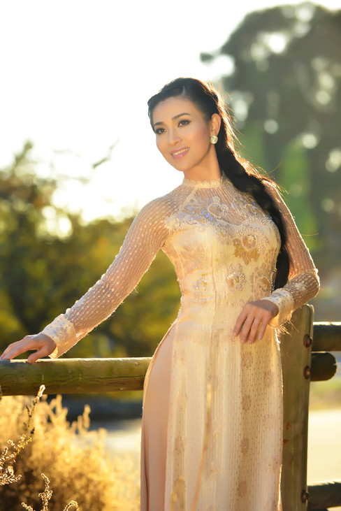 | Người đẹp Lý Ngọc Thu duyên dáng áo dài trên đất Mỹ. |